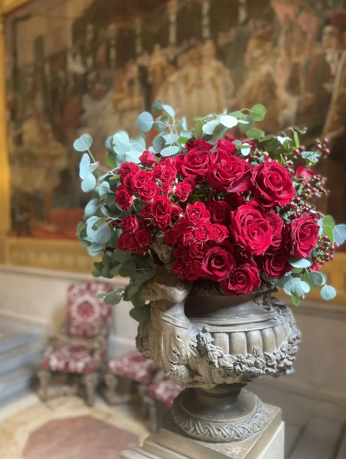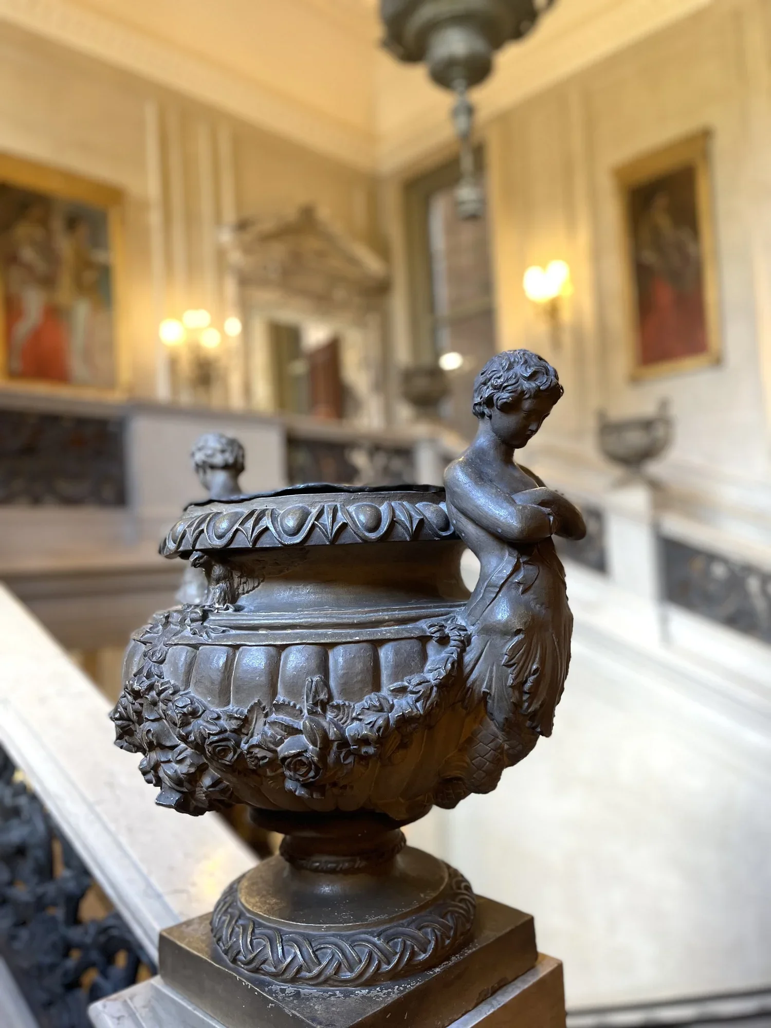 Six painted stone urn-shaped jardinière line the Great Staircase between the landings leading to the second floor.