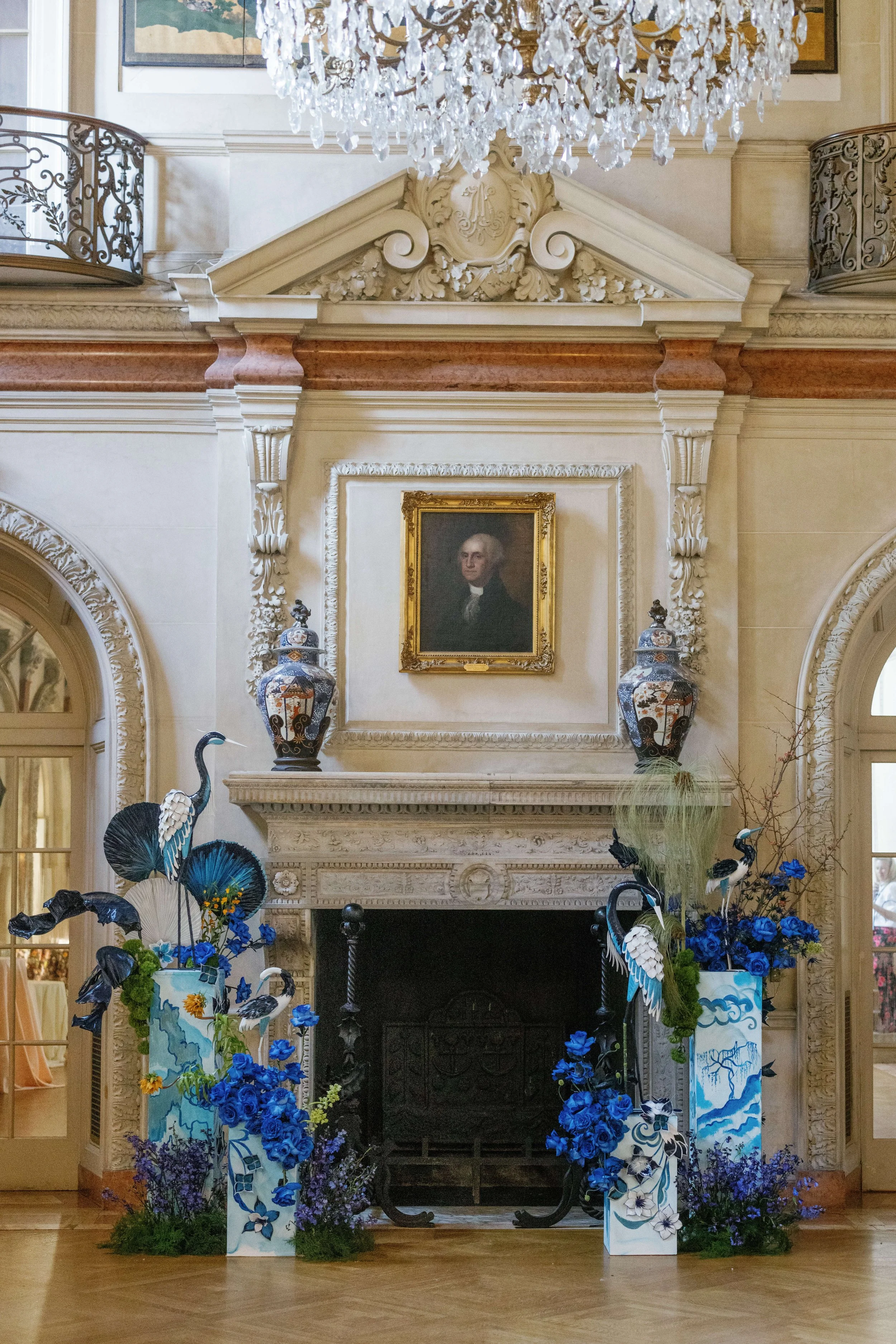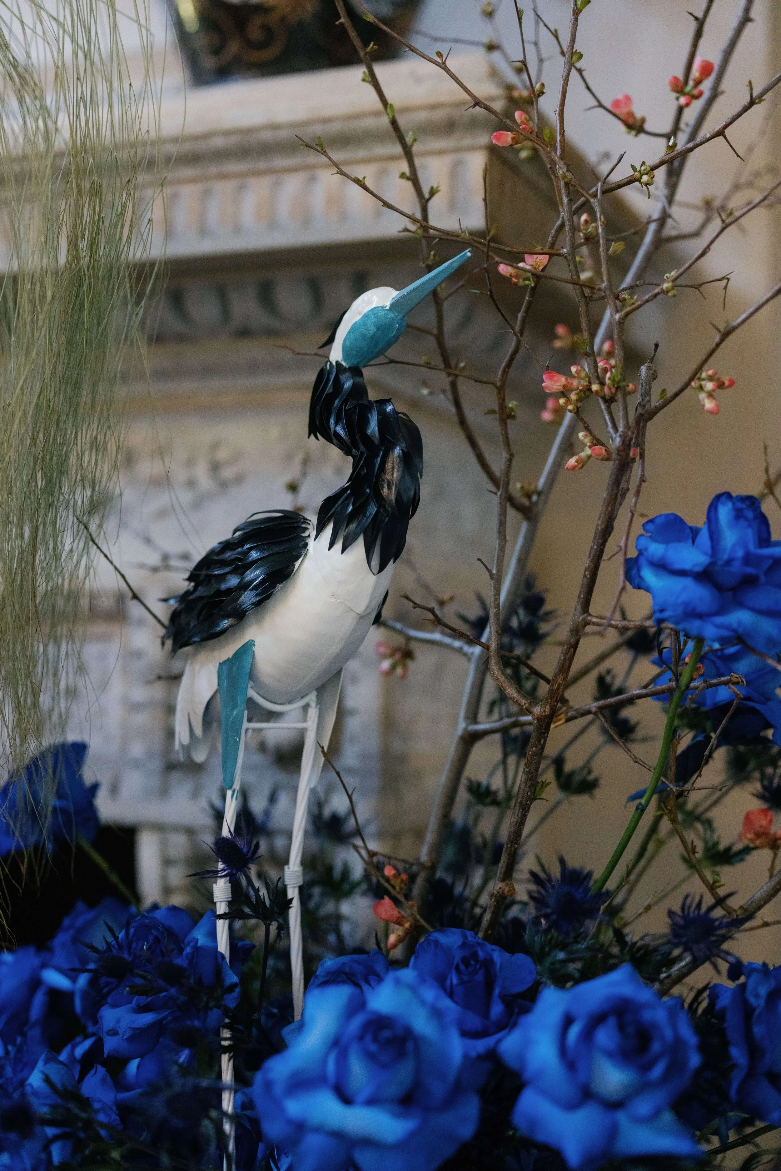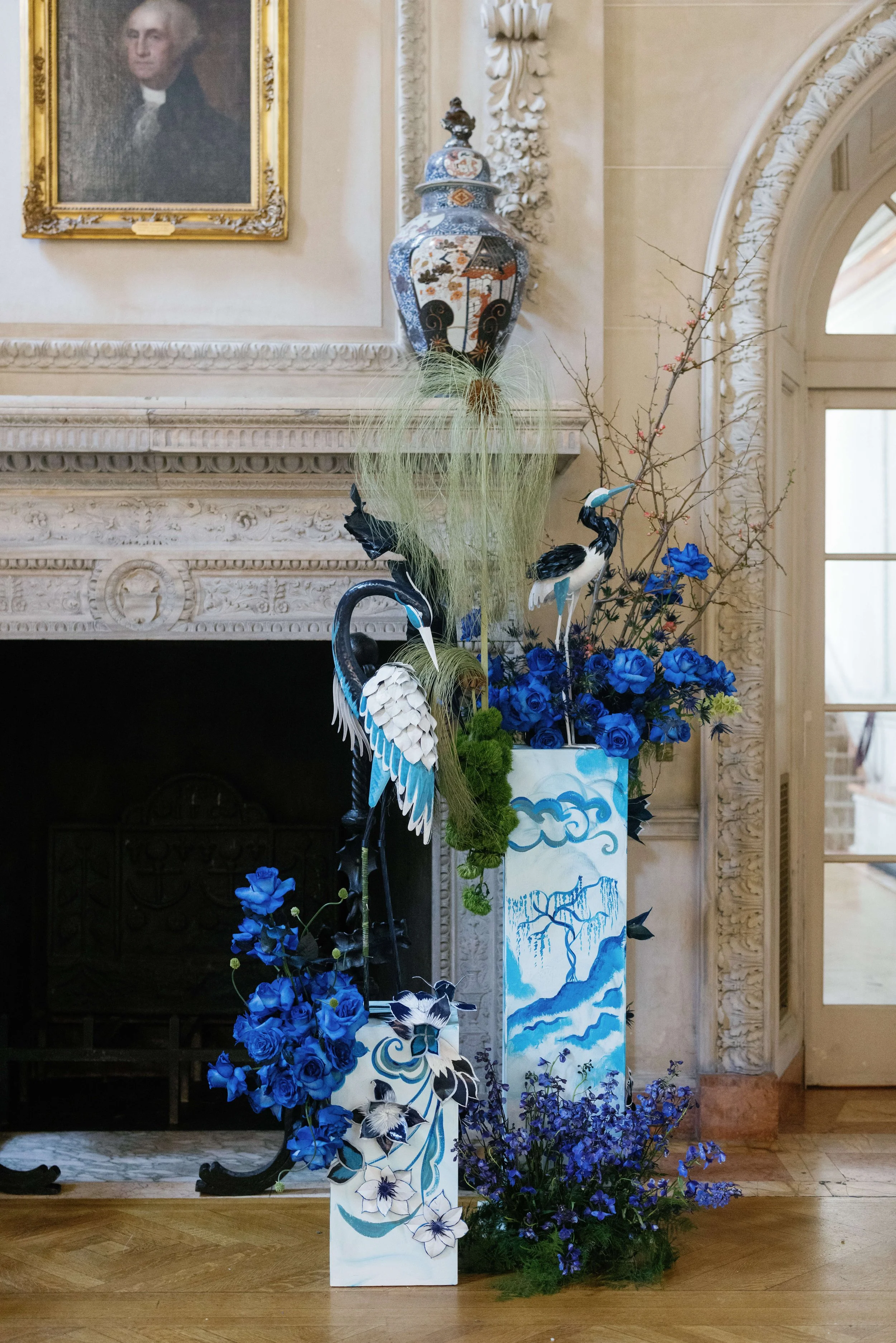 Florist’s inspiration: I love bringing a two-dimensional art piece to life to make the scene feel tangible. I wanted to have the elements of chinoiserie pop out by creating this scene in hues of white and blues most common to chinoiserie art, as in these stunning vases. I have been a longtime fan of flora and fauna and this piece allows me to incorporate both through my favorite medium, flowers.