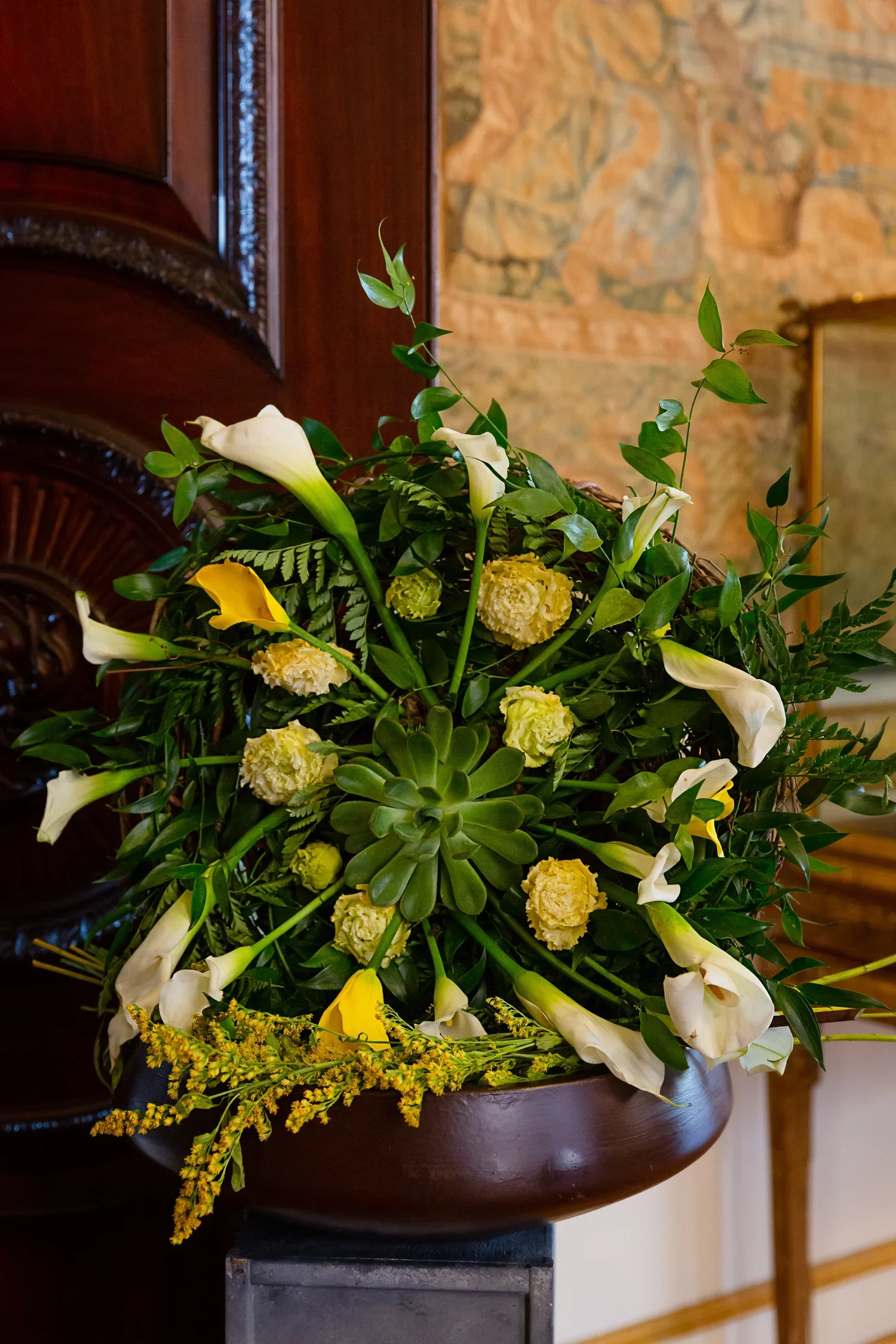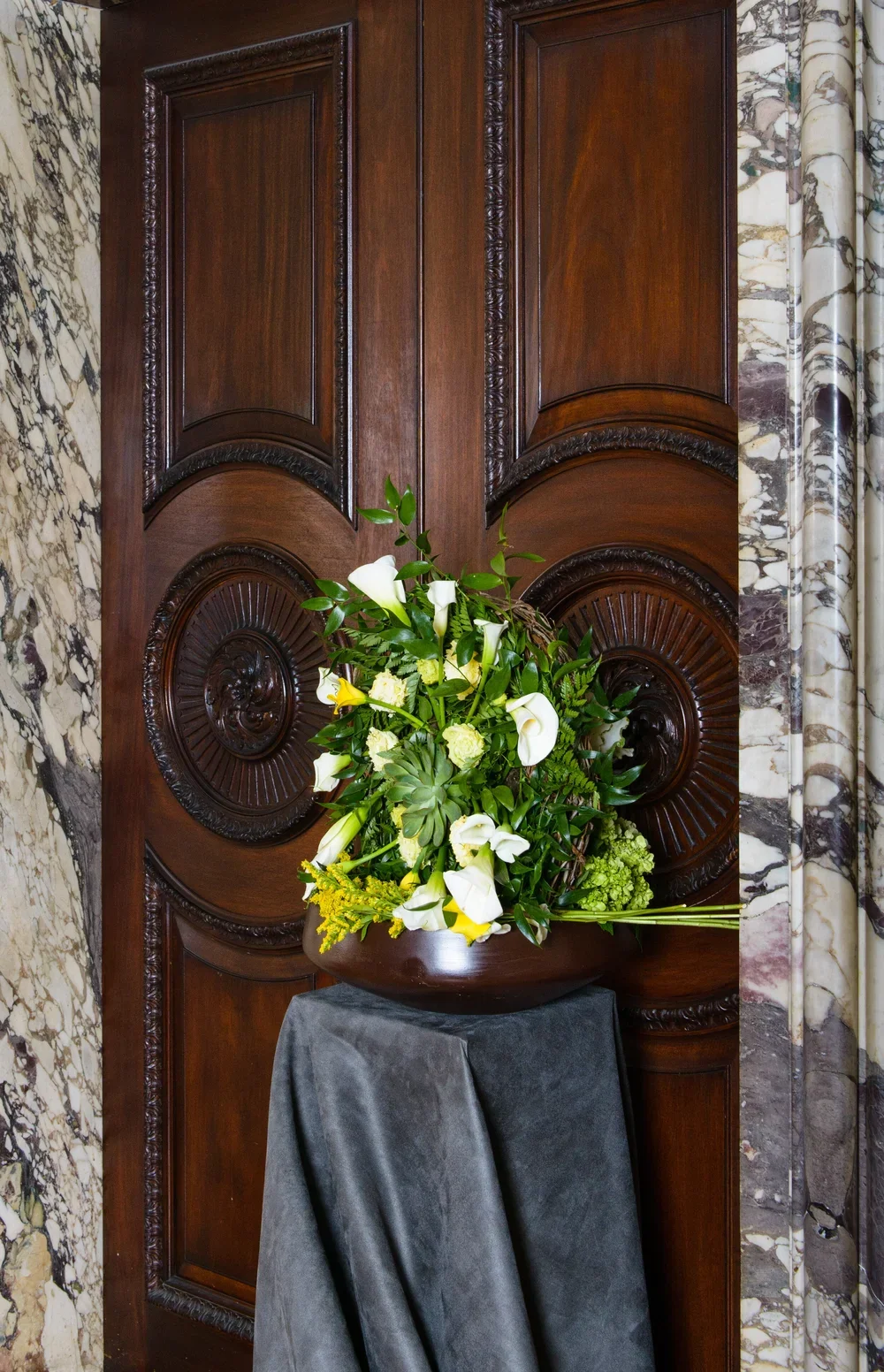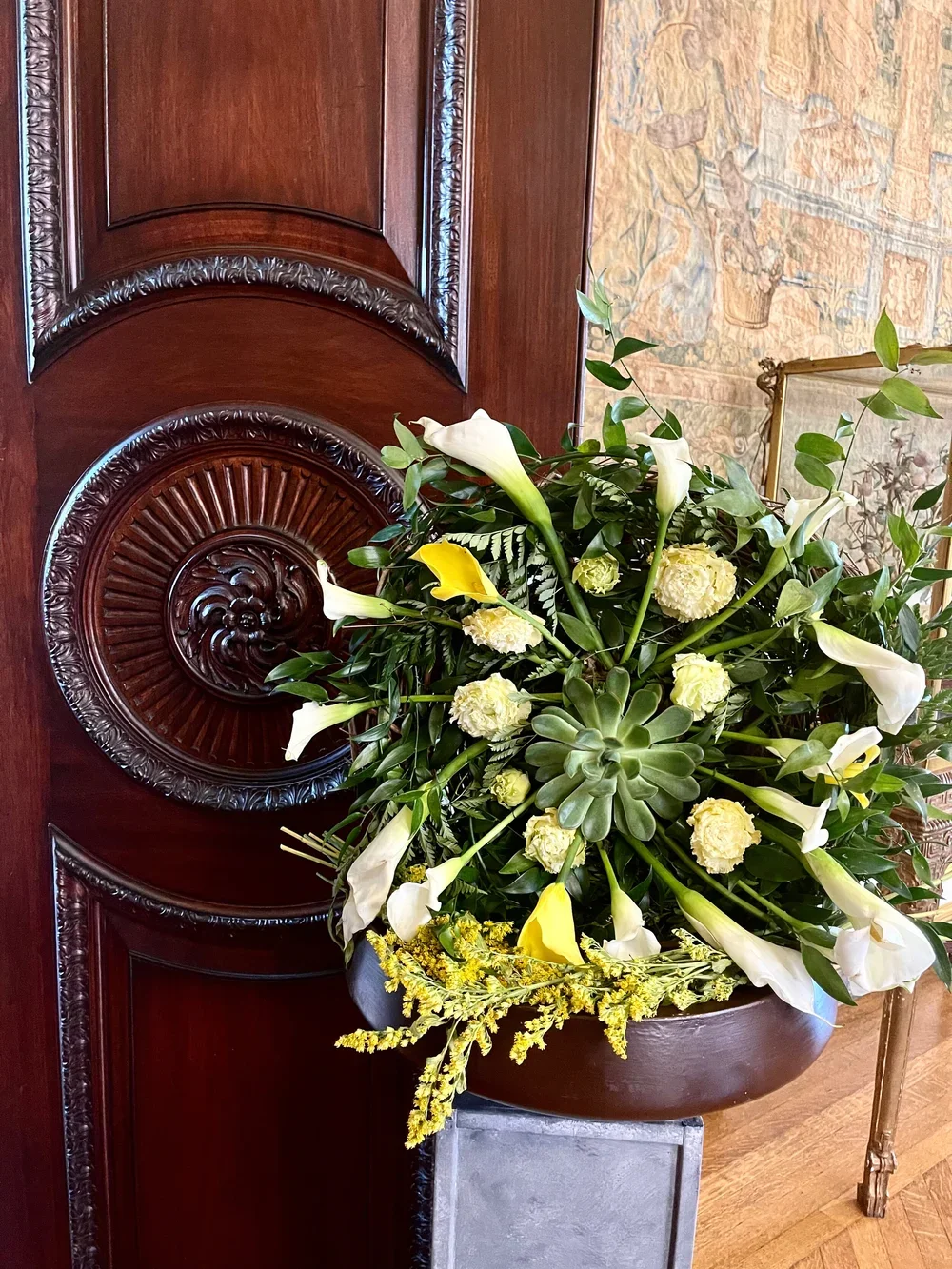 Florist’s inspiration: The exquisite floral carvings, signature artwork of the six decorative double door panels incorporated into the mansion’s second floor, was uniquely inspiring because 1) with florals, the carving gives life to, makes beautiful, and elevates what is perceived to be a very mundane and solely serviceable aspects of our lives -- the door -- to its true level of importance as one of the more powerful symbols throughout time; and 2) in alignment with the philosophy and practice of Plants and Blooms ReImagined, the carved florals, with the intentionality of permanence, will be reimagined as a new and extended expression of beauty and giving!