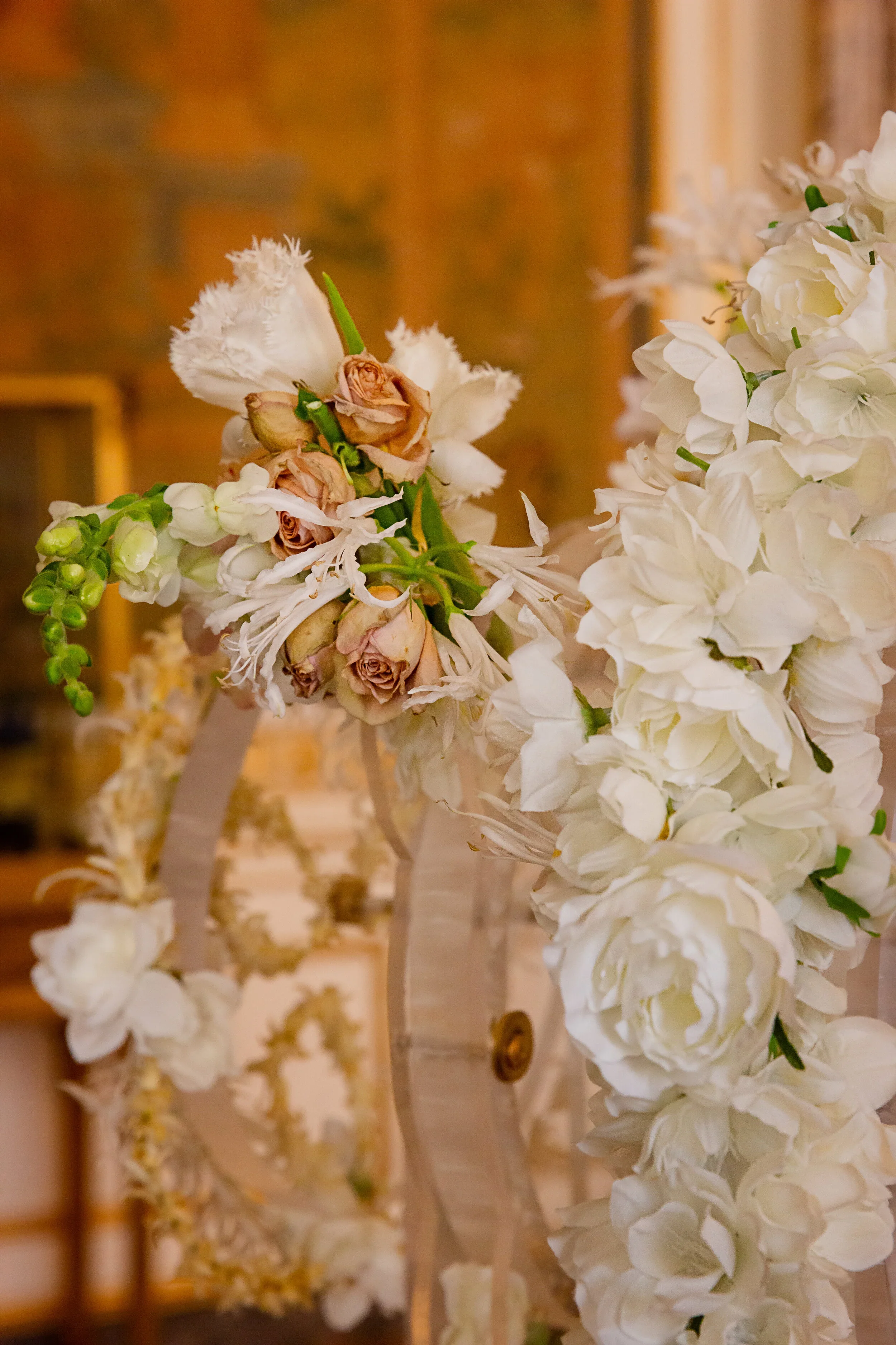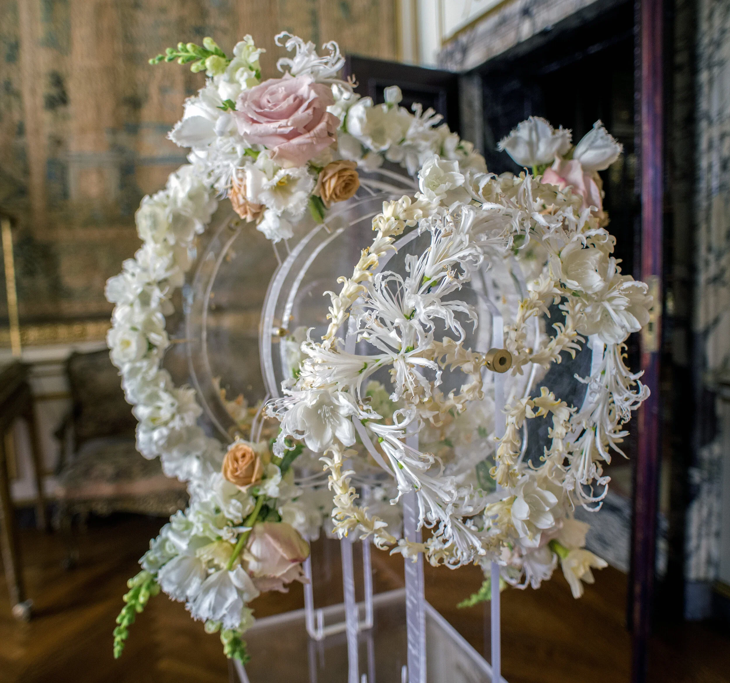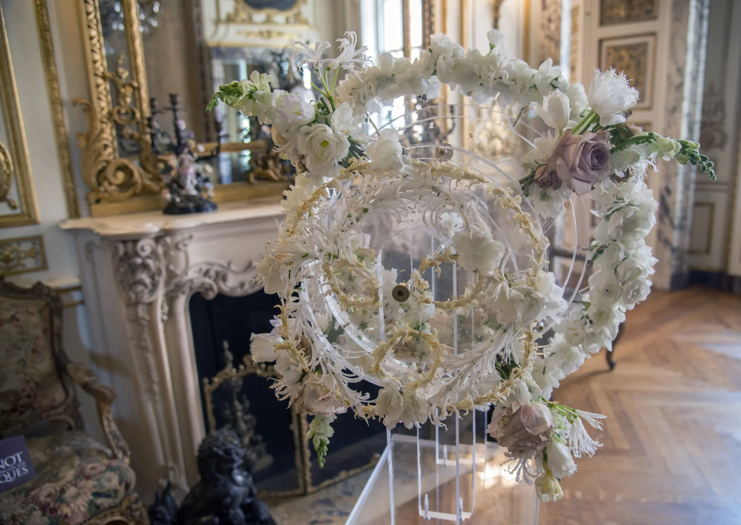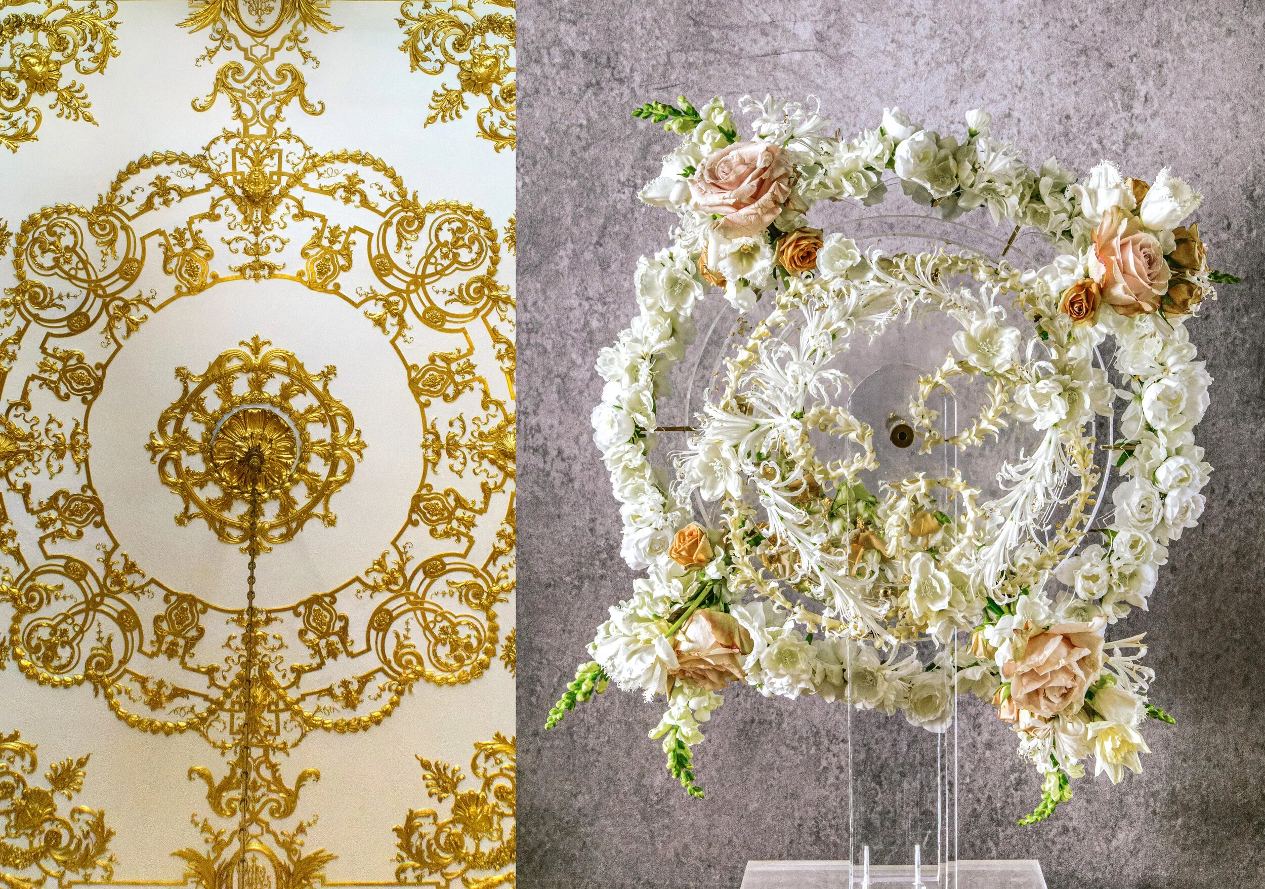 Florist’s inspiration: I have always been drawn to the French drawing room ceiling with its intricate detail and gilded floral elements but as I entered the drawing room during the walk-thru, the ceiling came to life in my imagination. I could see all the intricate layers of floral textures in a 3-D representation and immediately knew I wanted to create an interactive layer of curling florets and gilded flourishes. The middle of the two larger wheels is filled with real gold leaf and flower petals to give a nod to the gilding of the ceiling and the sparkle of a traditional kaleidoscope. The drawing room historically has acted as a passageway for guests entering dinner and my floral kaleidoscope acts as a passageway into imagination and child-like whimsy, inviting you into a moment of escape through beauty and play.