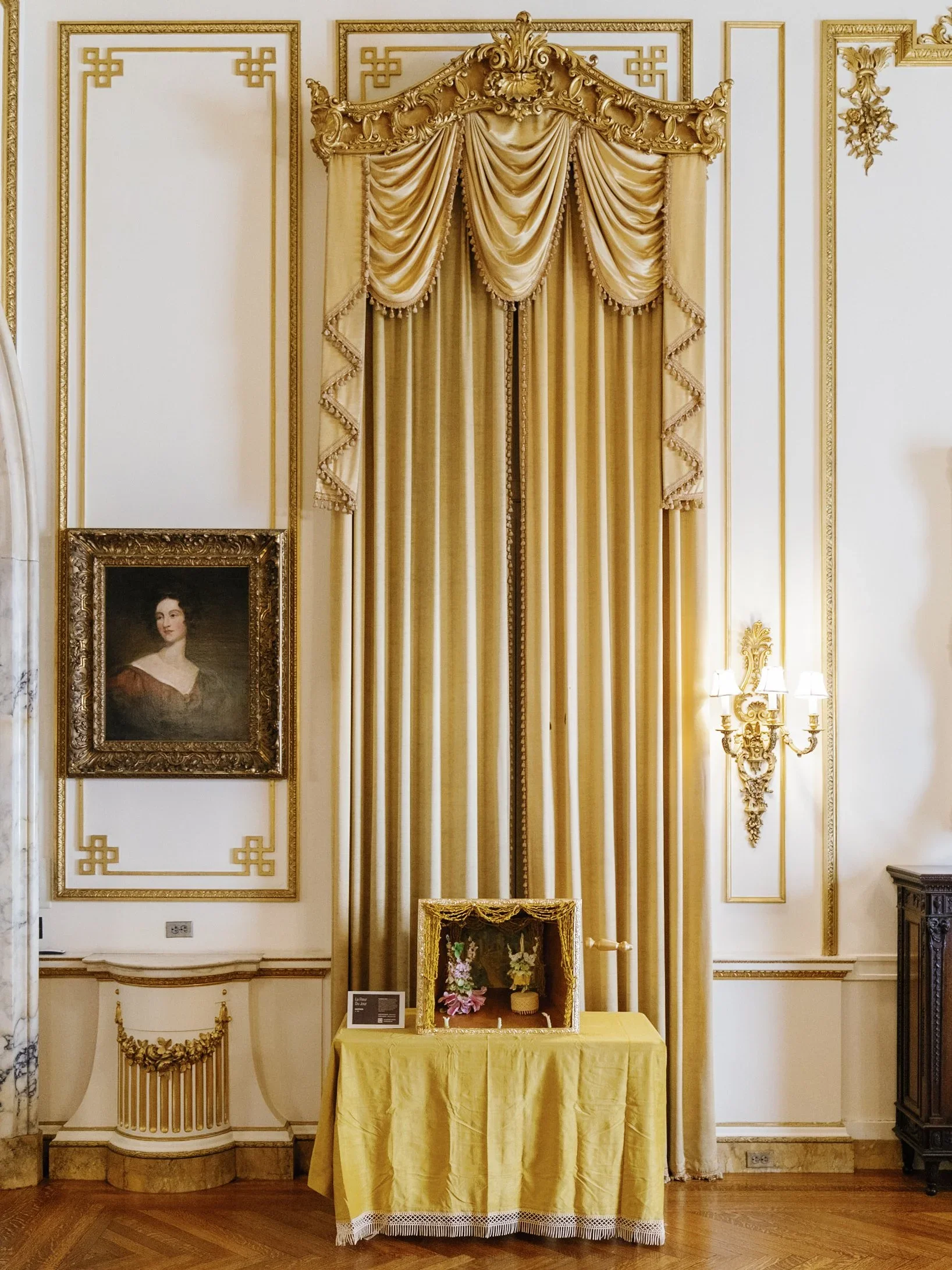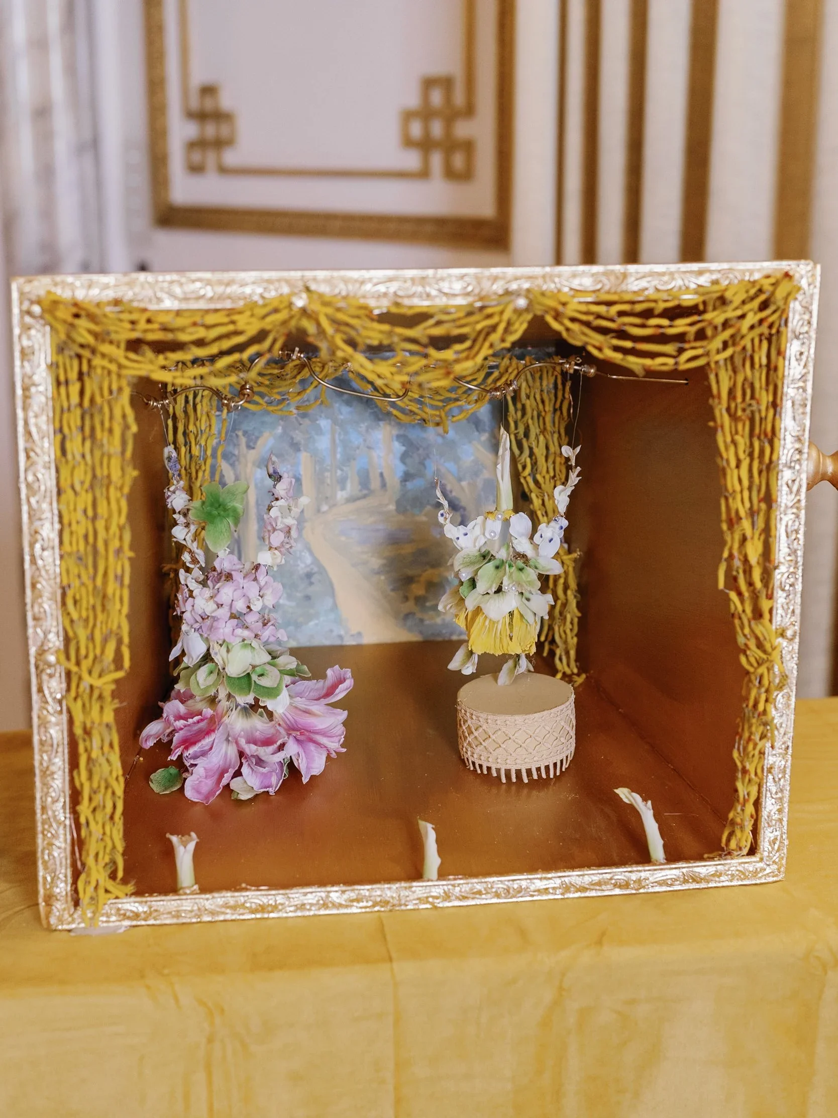 Florist’s inspiration: This piece is inspired by the historical genre of entertainment called vaudeville, an evolution from the French Comédie-Francaise marionette shows, and the heavy velvet drapes often seen in classic gilded theatres. These productions were a popular form of entertainment, where entertainers would put on a show for the masses, prior to film and television. Vaudeville evolved from traveling minstrel, circus, freak, and French mime shows of the early 19th century. It often consisted of dancers, strong men, impersonators, acrobats, singers, trained animal acts, clowns, ventriloquists, dancers, and magicians. Examples of the form can be seen as late as mid-century in classic tv shows such as The Dick Van Dyke Show and I Love Lucy, and the films Singing in the Rain and White Christmas. These gold drapes transported me to the smell of these theaters with their dark wood, musty air, and the hushed whispers of an audience anxiously await- ing magic. Marionettes and puppetry have been pop- ular entertainment since ancient Chinese civilizations but have more recently been featured in public the- aters such as The Salzburg Marionette Theater in Austria, given nod to in "The Lonely Goatherd" scene in “The Sound of Music”, — a source of inspiration for this piece.