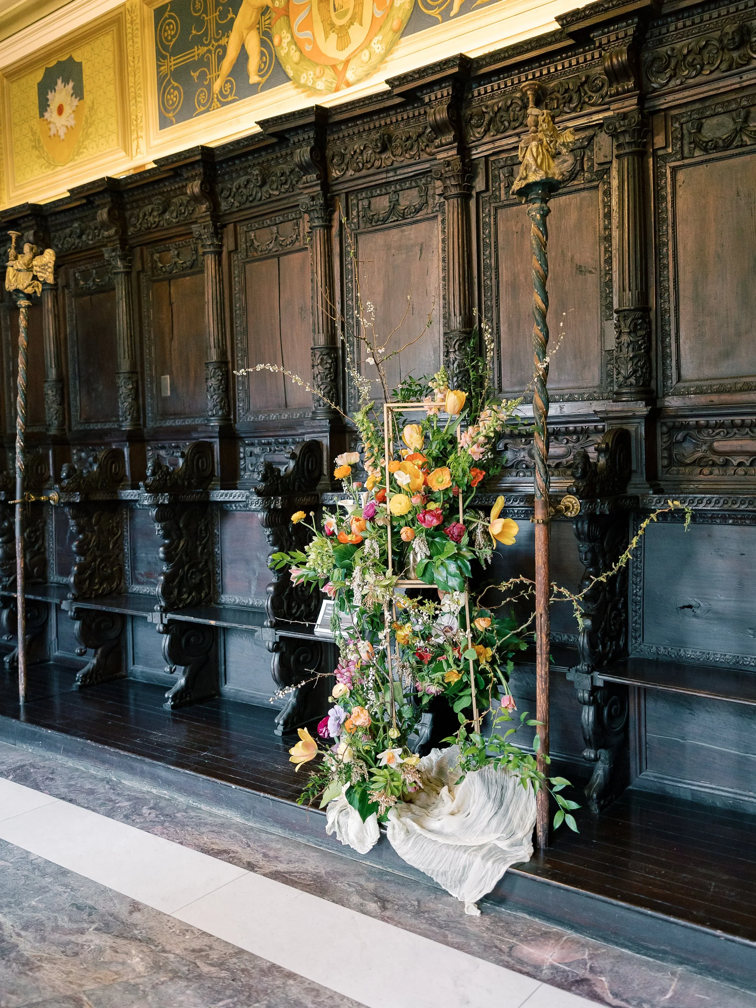 Florist’s inspiration: Our design takes inspiration from the structure of the choir stalls and the lines seen in the decorative carvings, while creating intentional contrast from the dark walnut wood. We like to have fun with our flowers so we’ve opted for a bright, bold color palette featuring stems that float and twirl off of our core structure, almost as if the carvings were to dance off of the choir stalls themselves. Everything used in our design has been sourced locally, resulting in a piece that reflects the season and honors sustainable design methods, a core principle of the Little Acre Flowers philosophy.