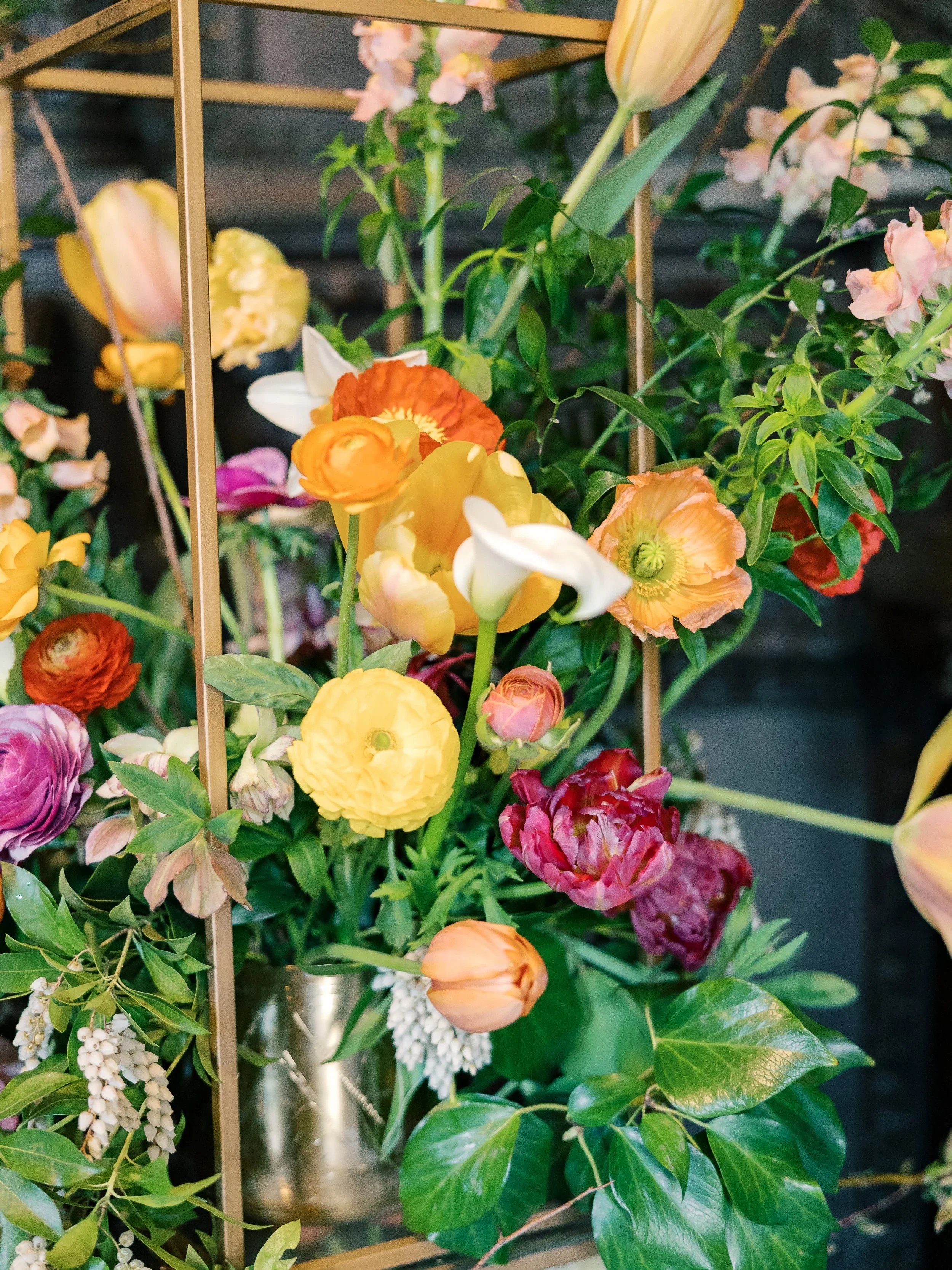 Recipe: Flowers and materials included have been sourced 100% locally. Some of what’s included: snapdragons, delphinium, poppies, ranunculus, tulips, daffodils, blooming branches, sweet peas.