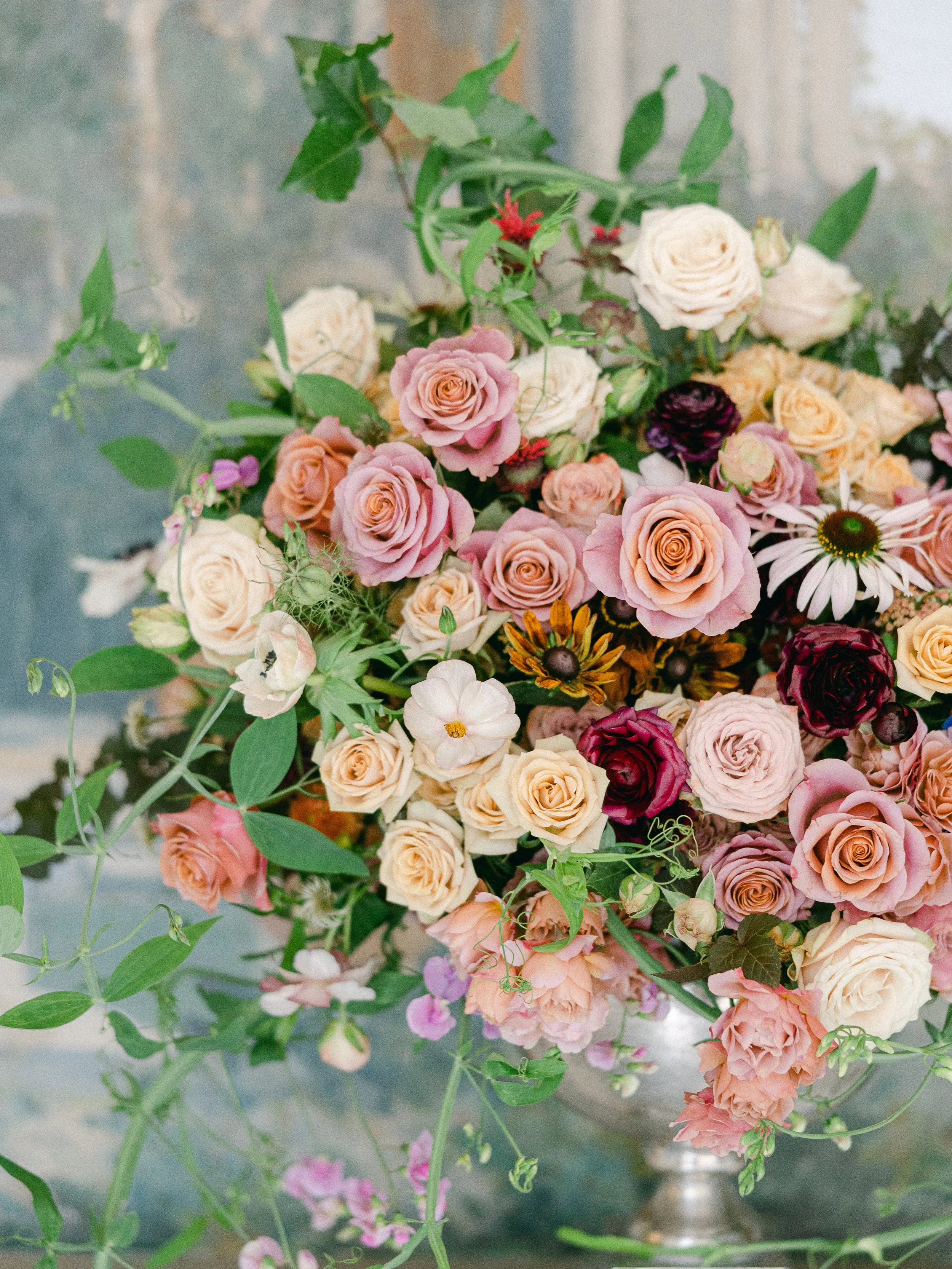 Florist’s inspiration: Gardens have always been a place of inspiration for me. Naturally, I was drawn to The Italian Garden at Weld. The lush texture and color palette evoked memories of my time in Italy. Working in a painterly style with the blooms and foliage, I tried to capture the essence of the garden and the ornate beauty of nature.