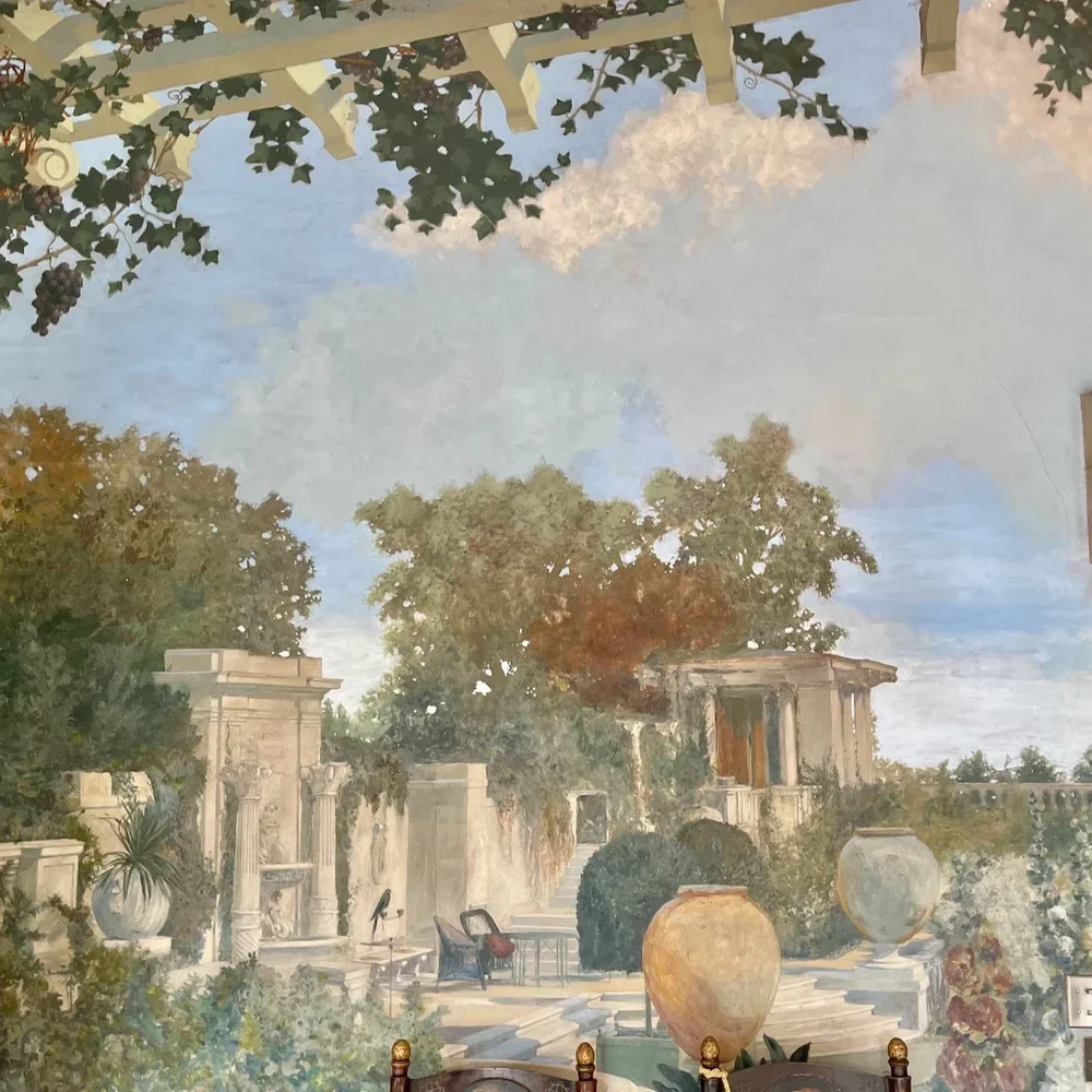 The 1909 corner mural done in oil-on-plaster mural by Carl Yens decorates the Andersons’ breakfast room. A vibrant reminder of the formal Italian garden they created at their primary home in Brookline, MA, called Weld, it features the stone terraces, colonnade, pergola, and fountain filled with lush greenery, including bay trees and topiary, and is accented by large antique Roman pots. Isabel’s pet macaw, Anna, is perched on a metal stand in the garden, and an oriole stands on one doorway frame.