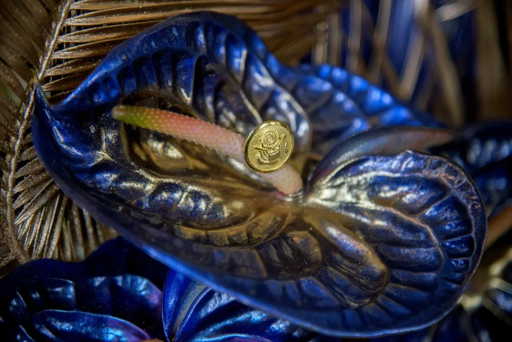 Florist’s inspiration: Made of navy blue wool, sequins, gold, silk and cotton, this tailcoat from a diplomatic uniform was commissioned by Larz Anderson one year before President Taft appointed him to the highest post of his career, Ambassador to Japan. The coat has elaborate gold bullion and sequin embroidery in a laurel leaf and berry design at the standing collar, chest, waistline, tails, and cuffs. It is lined in a beige silk and closes with metal hooks and eyes that alternate sides down the front of the collar and center front. Nine ornamental convex gold buttons with the Great Seal of the United States descend down the center front closure, with two buttons at the center back. The uniform also includes trousers, overcoat, a ceremonial hat and sword belt. The Andersons did not display the uniform, but the Society has since the 1940s.