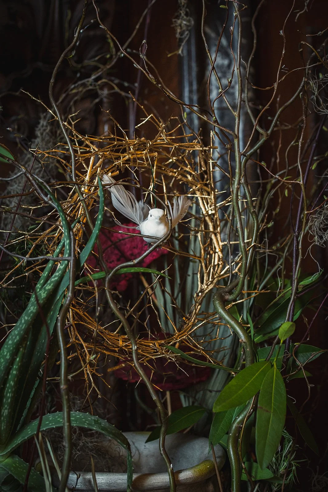 Florist’s inspiration: The last supper is one of the few specifically Christian artworks at Anderson House, depicting the moment at which Jesus announces he will be betrayed. Shortly after the meal, he arrested, tried, and then crucified. After he has passed, he is placed in a tomb. The time from which he was crucified to the time in which he is risen is called Lent, and this year Art in Bloom happens to fall during Lent. Traditionally during Lent the National Cathedral does not use flowering blossoms in sacred spaces as a way of remembering and paying homage to Jesus’s time in the tomb. Following that tradition, only greenery, pods, mushrooms and sticks have been used in the design.
