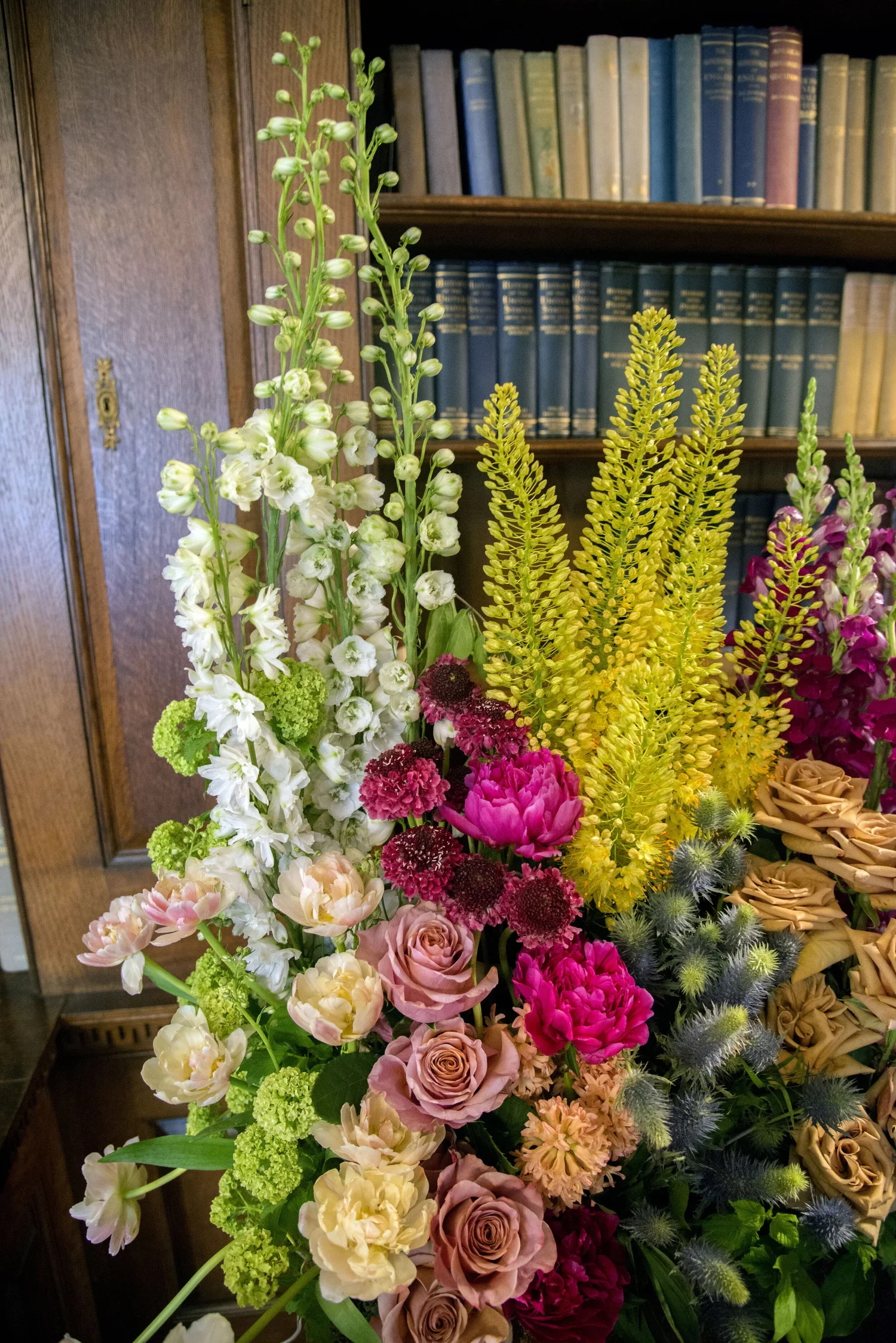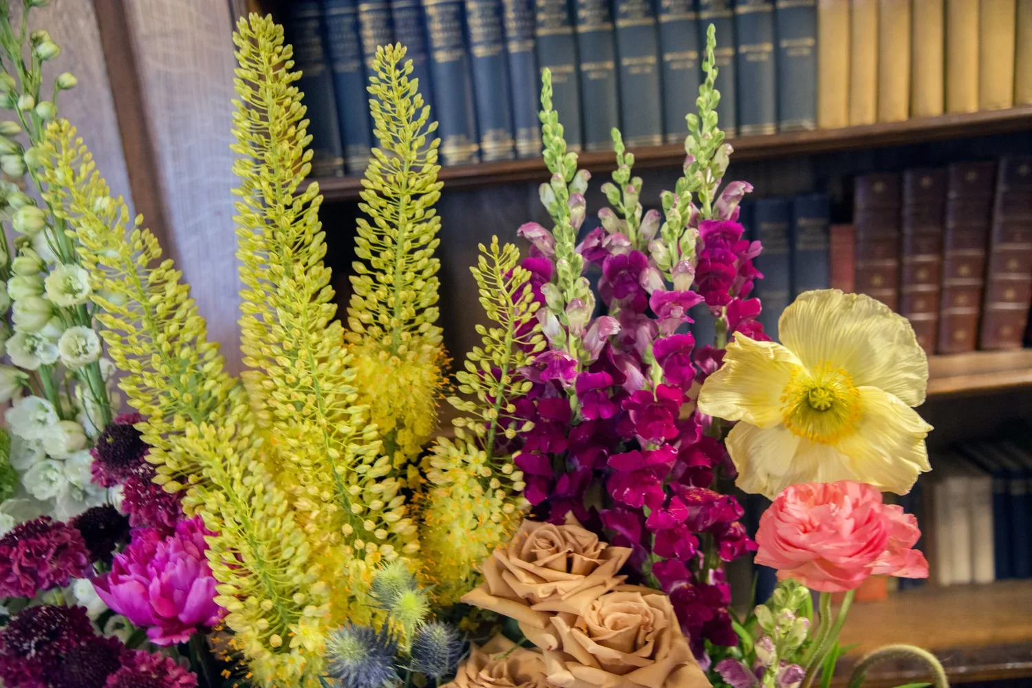 Floristās inspiration: My piece is inspired by the bookshelves in the library and my love of reading and flowers and their timeless appeal. The piece will reflect the linear quality of the books and shelves along with the colors of the books.
