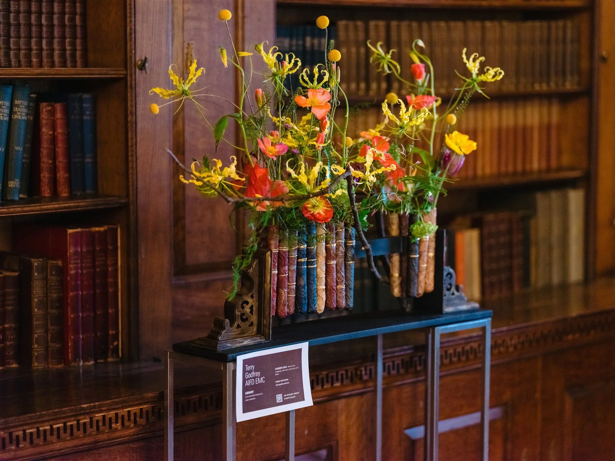 Florist’s inspiration: I'm hoping to capture the contrast between the solid mass of the "books" (water tubes) against both the negative space below and the light transparency of the botanical material above.