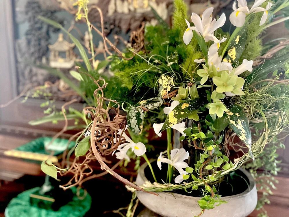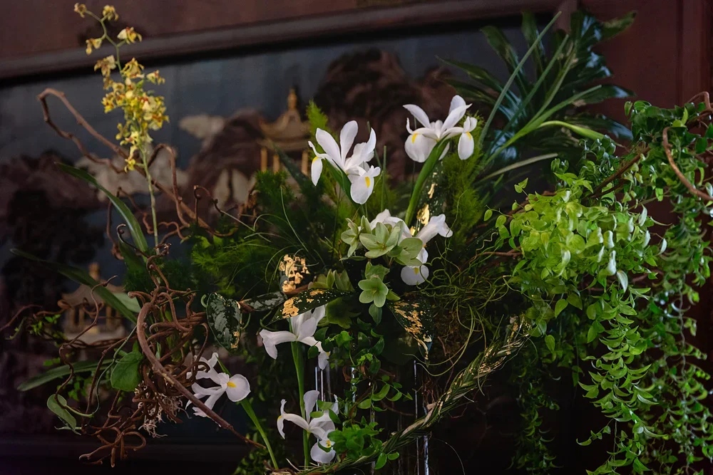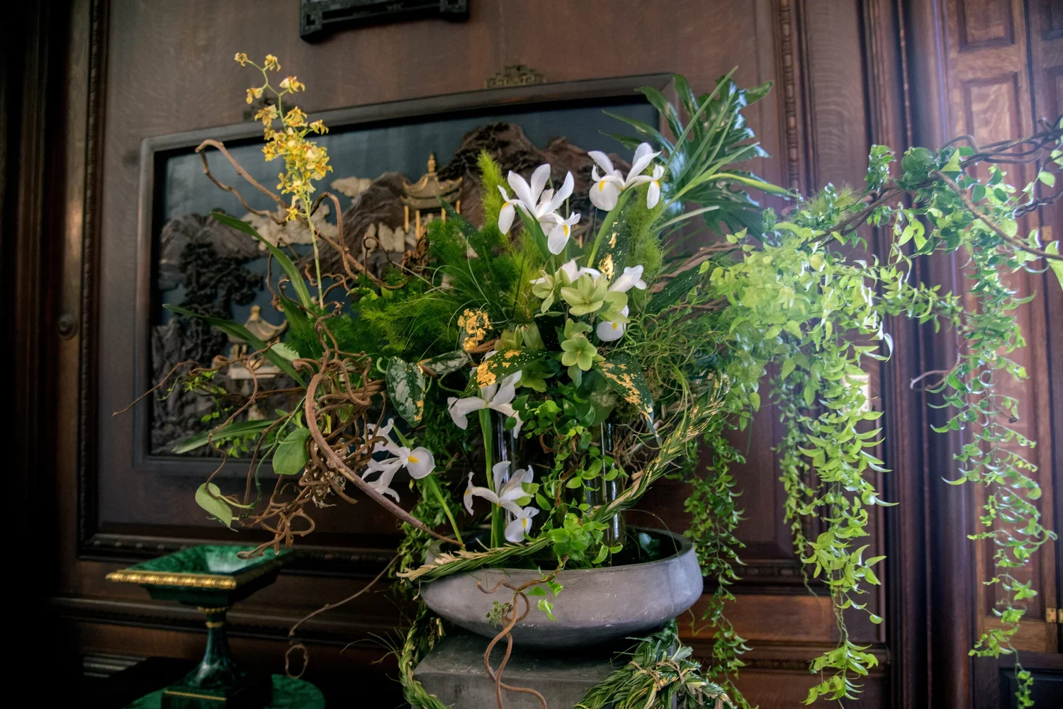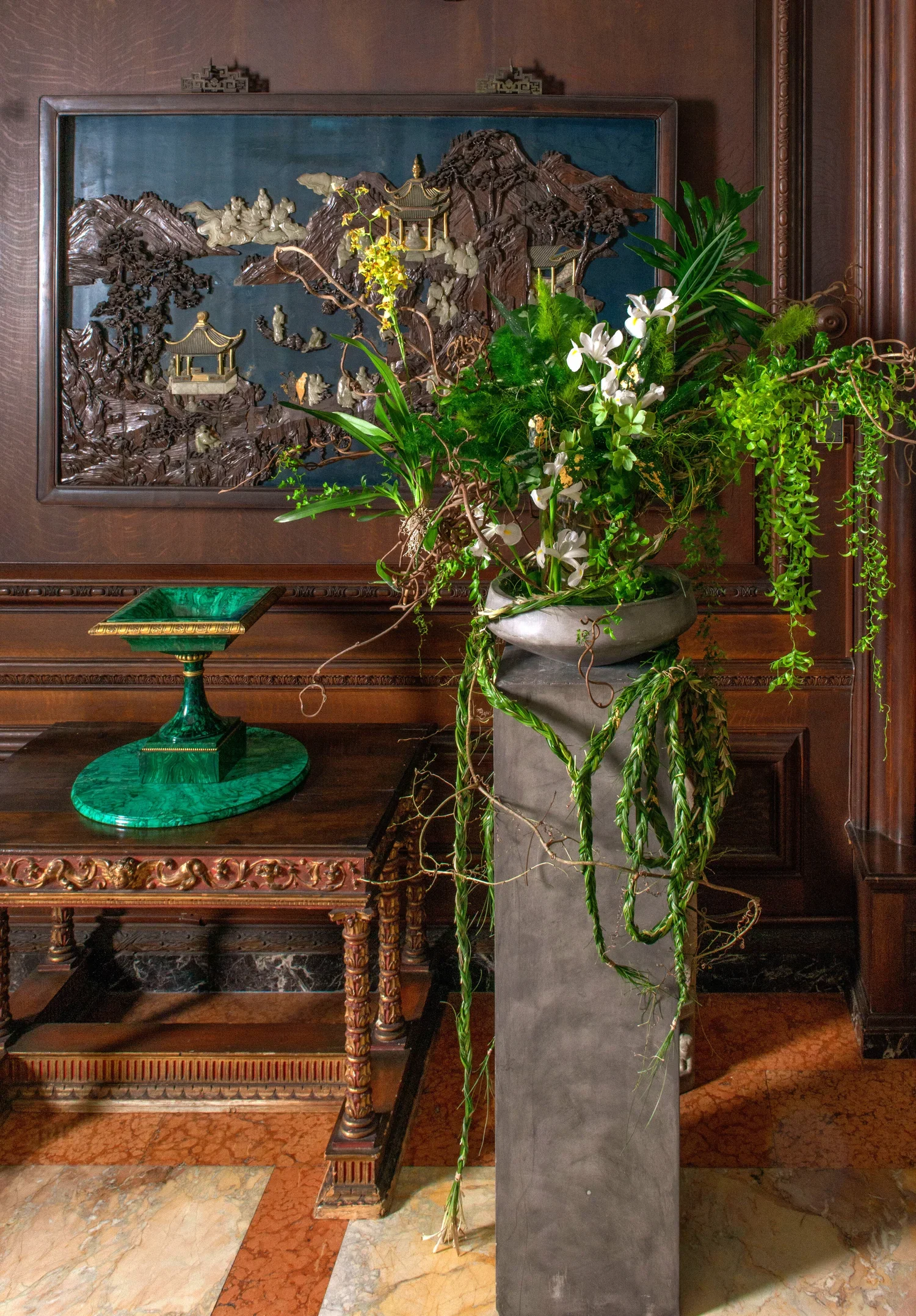 Florist’s inspiration: Drawing inspiration from the dark green malachite veneer, our Art in Bloom creation features intricate botanical details with braided materials that will envelope the design. With malachite being an emblem of protection, growth, and positive change, the surrounding materials will create a barrier around the delicate blooms inset the composition.