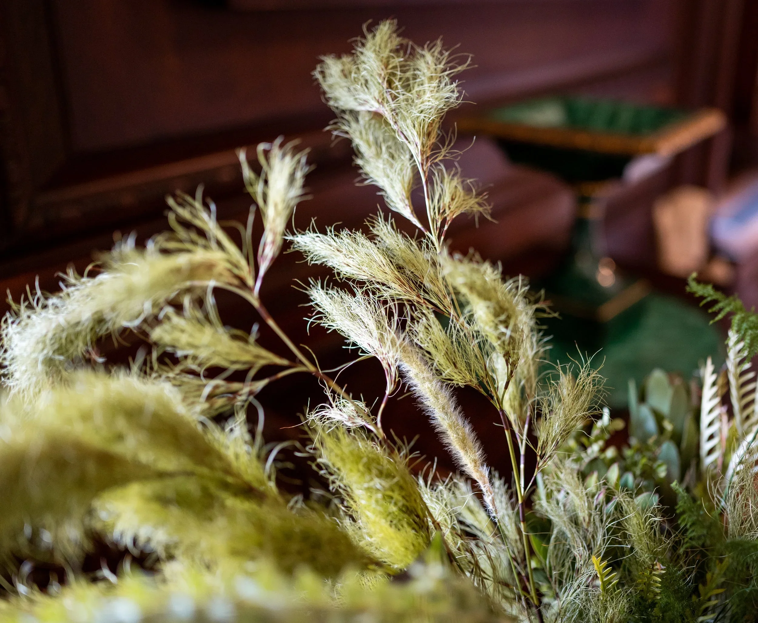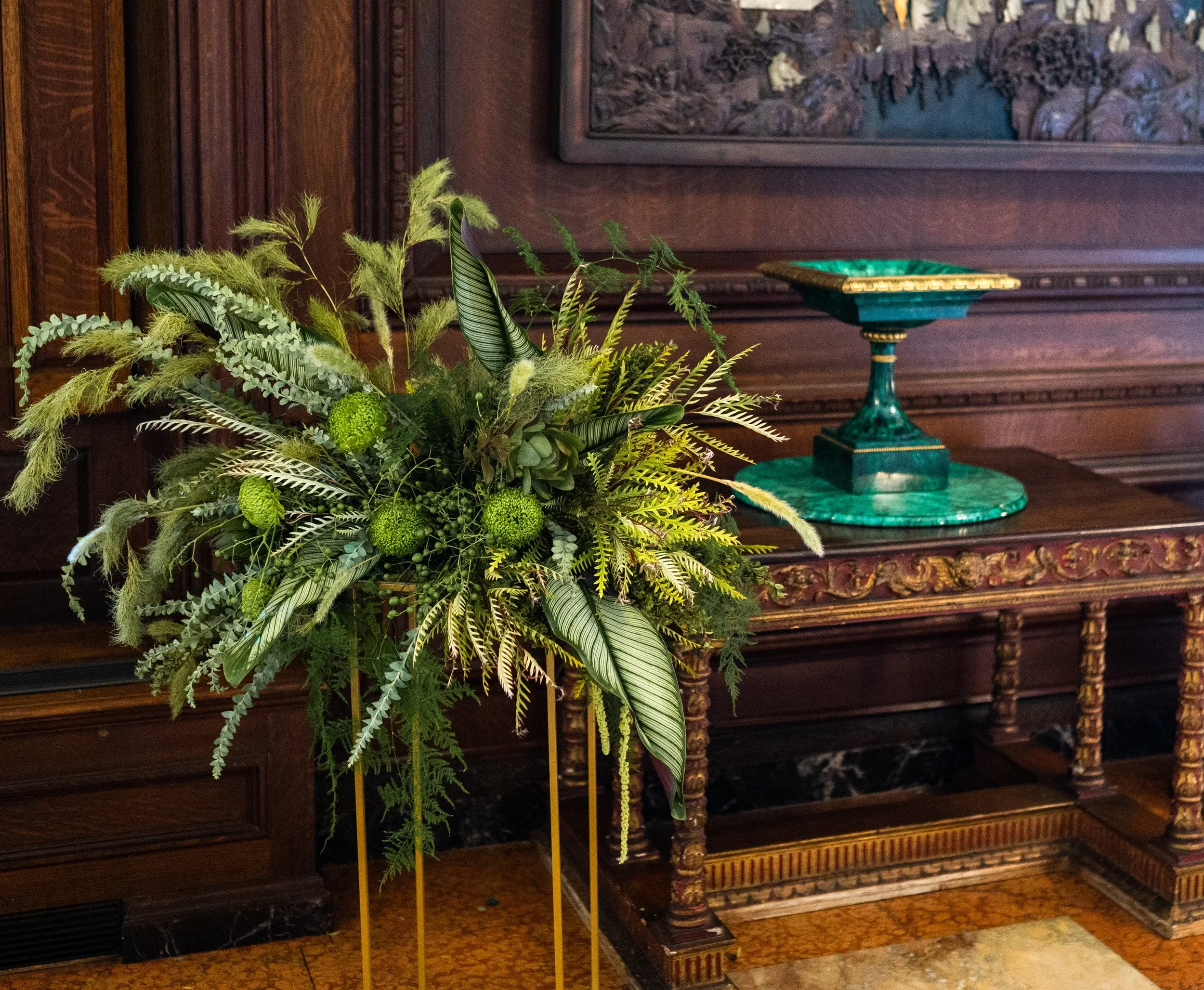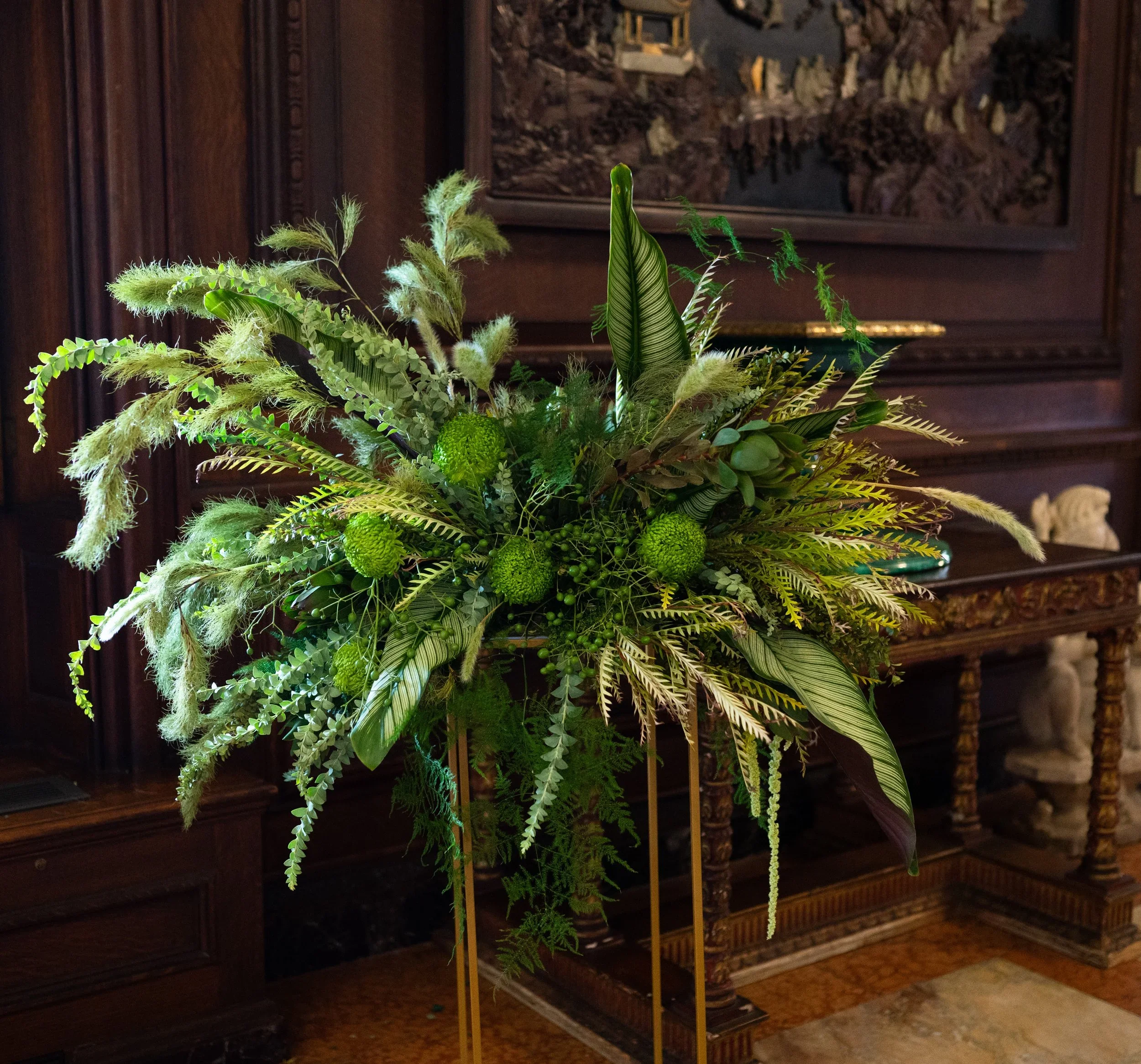 Florist’s inspiration: For this piece, I wanted to embody all of the many things the color green represents. Green is universally associated with nature, but also symbolizes growth, renewal, and wealth. Flowers in particular can represent these same exact things.