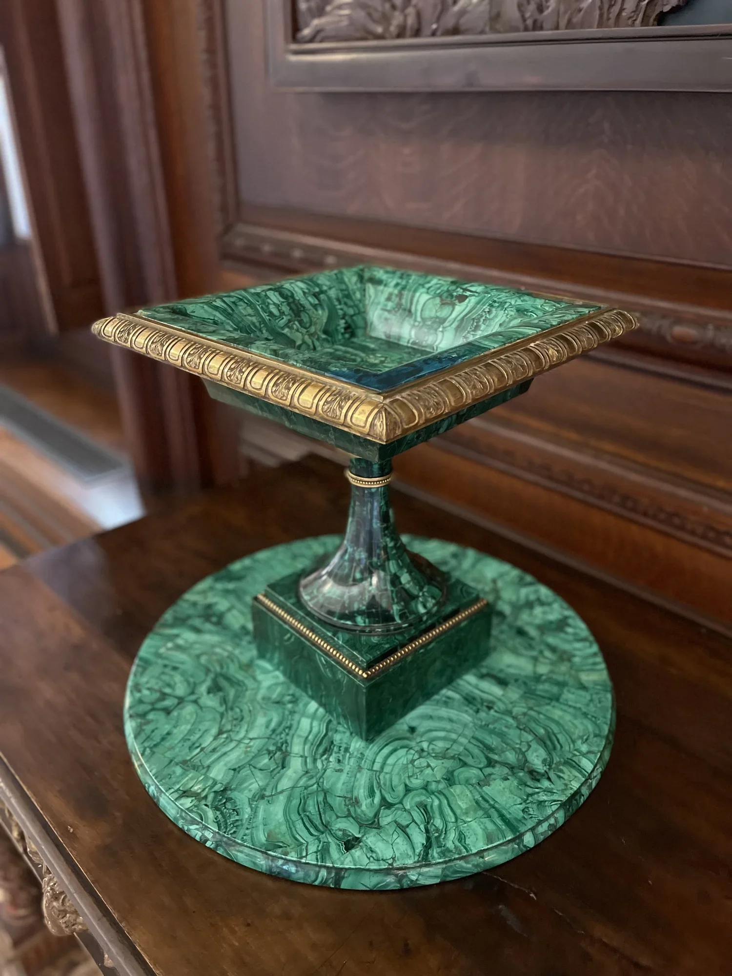 This large decorative tazza, or wide shallow dish, is covered in thin sheets of opaque green malachite with molded gilt bronze trim. It rests on a separate circular malachite tabletop plate. The pair were made in Russia, which had become famous for producing malachite objects. Larz Anderson purchased these pieces in St. Petersburg in 1910.