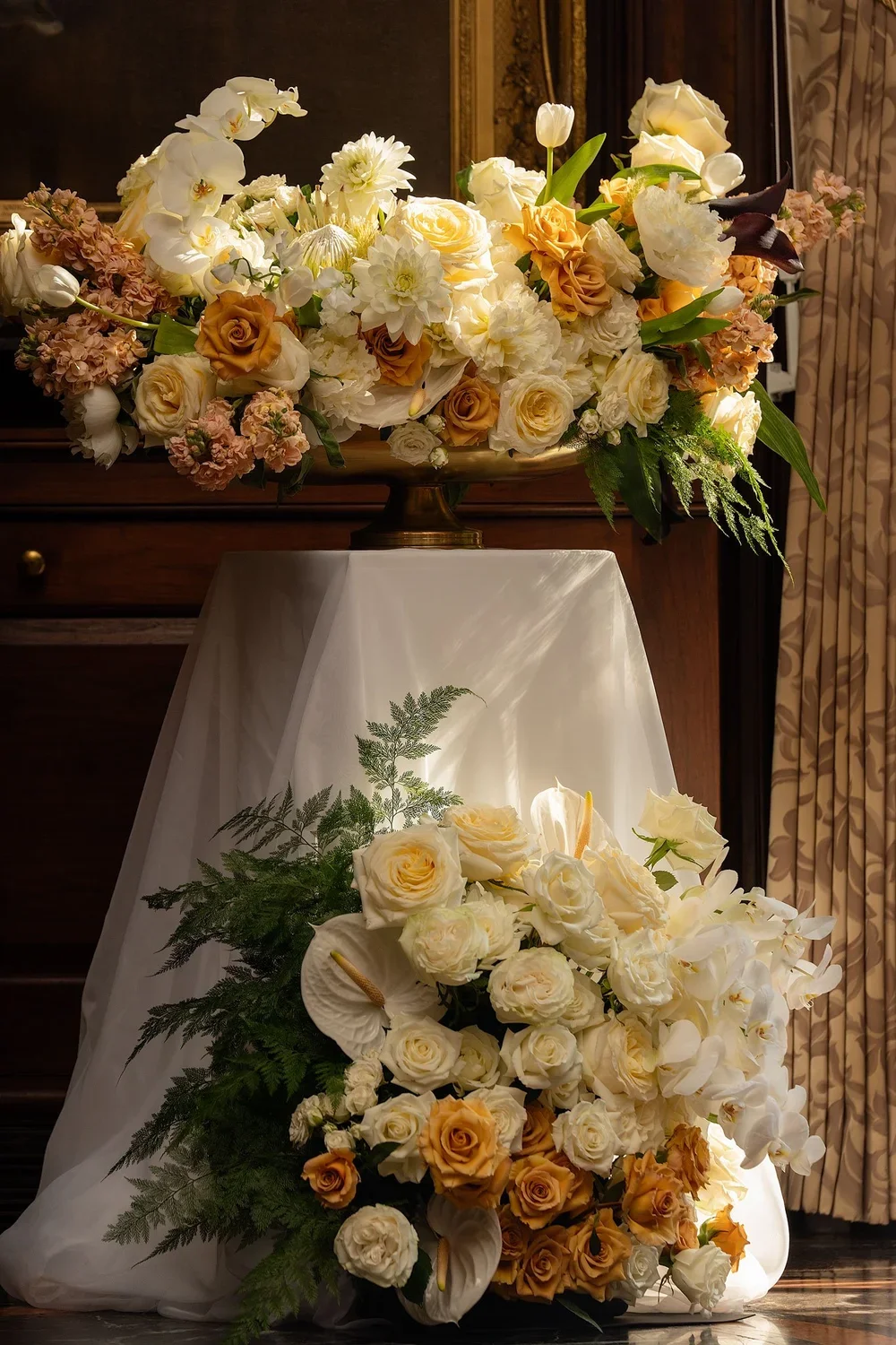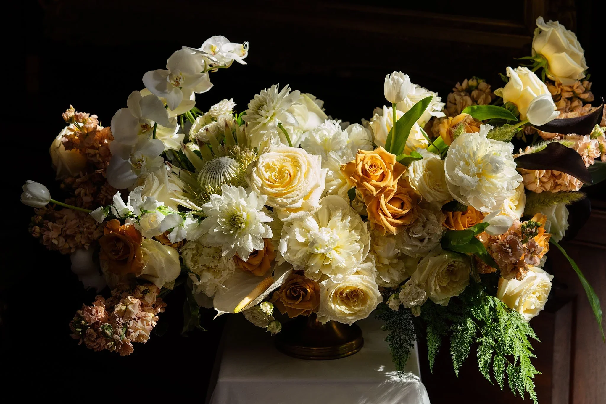 Organic design elements in my floral piece creates a lush floral arrangement with soft, light color flower blooms and accent of black calla lilies, for the drama effect. Elegant blooms of garden roses, lush peonies, sweet peas, orchids, tulips and each ingredient bring a unique element to the mix that completes this lush design. Arranged in a rich gold pedestal urn, with flowy bottom piece, complements Mrs Anderson's one of a kind gown.