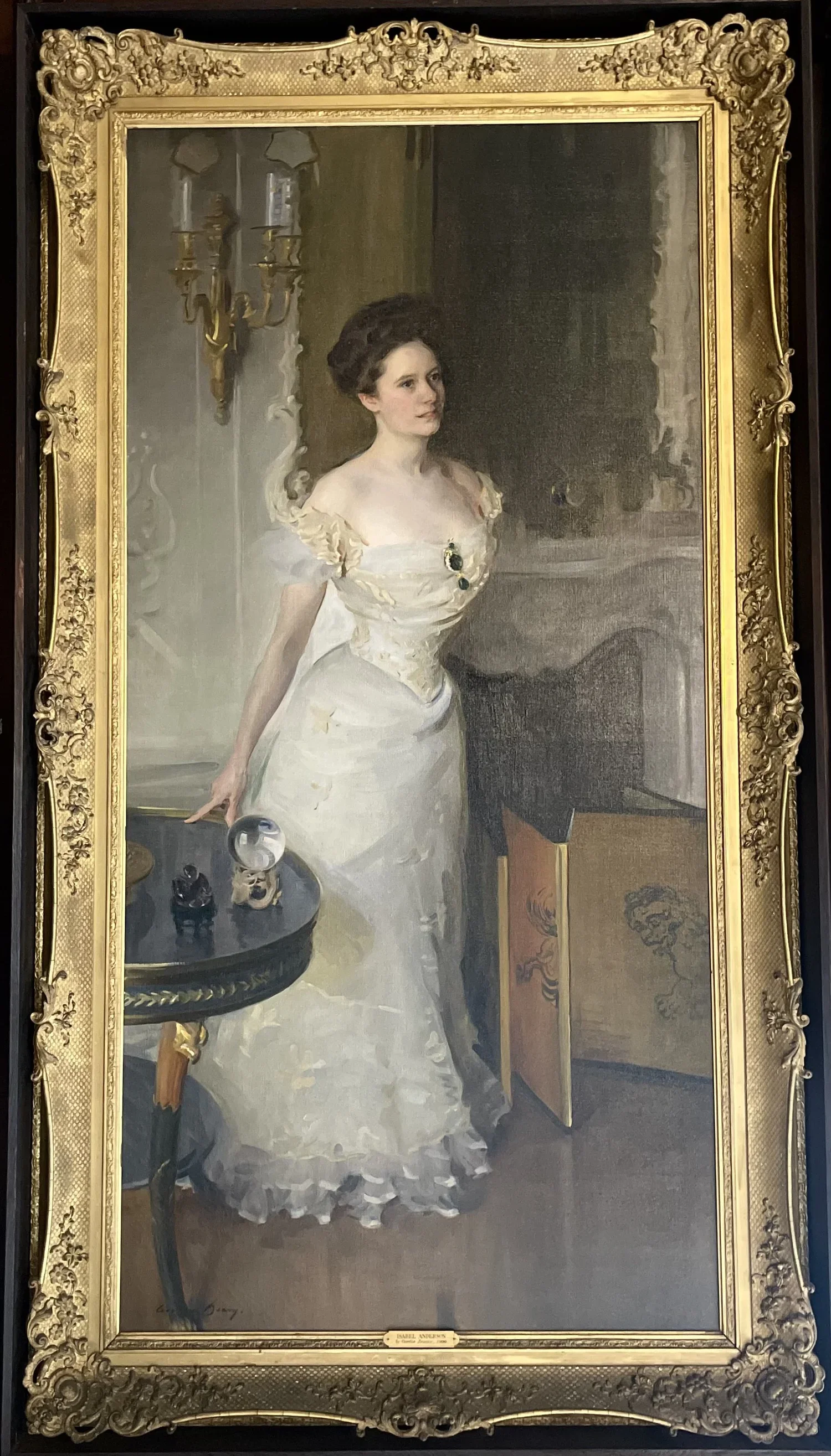 This formal portrait of Mrs. Larz Anderson, Isabel Anderson, was finished in 1901. Painted by American artist Cecilia Beaux, the portrait depicts Isabel wearing an evening gown designed by Worth of Paris and an Indian emerald brooch.