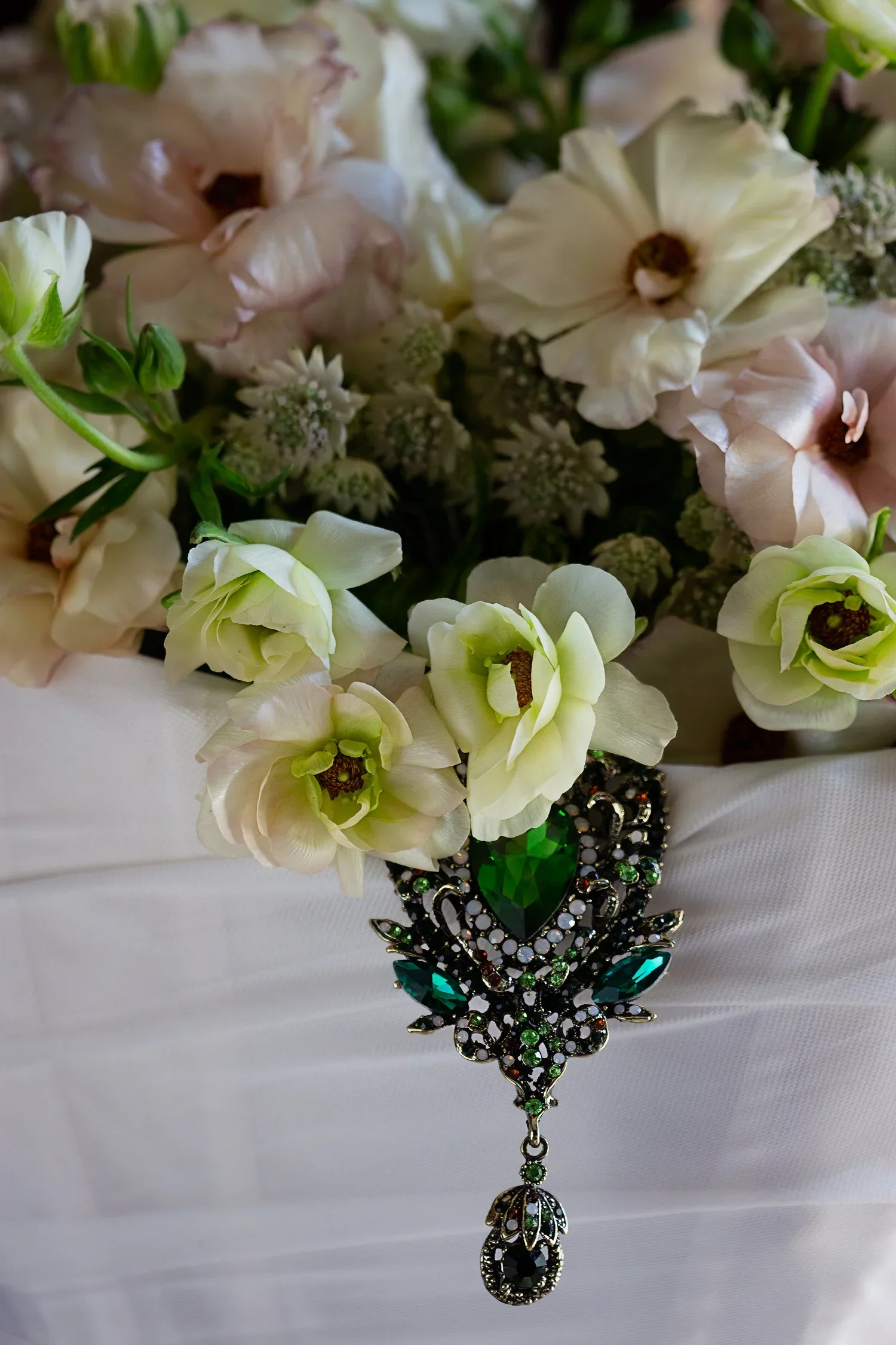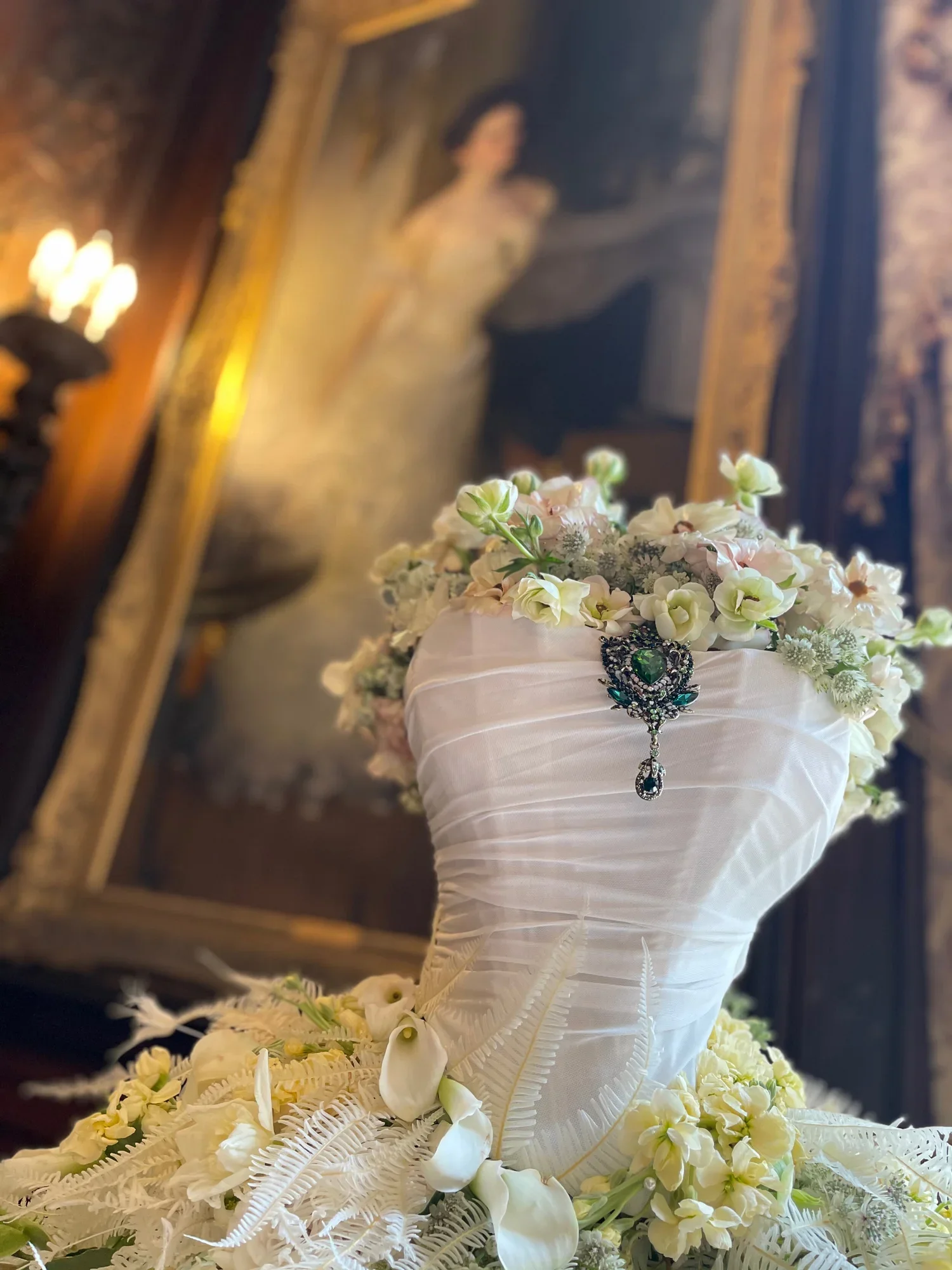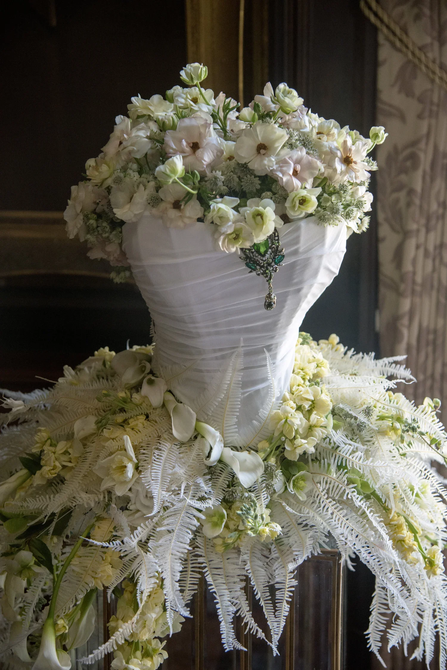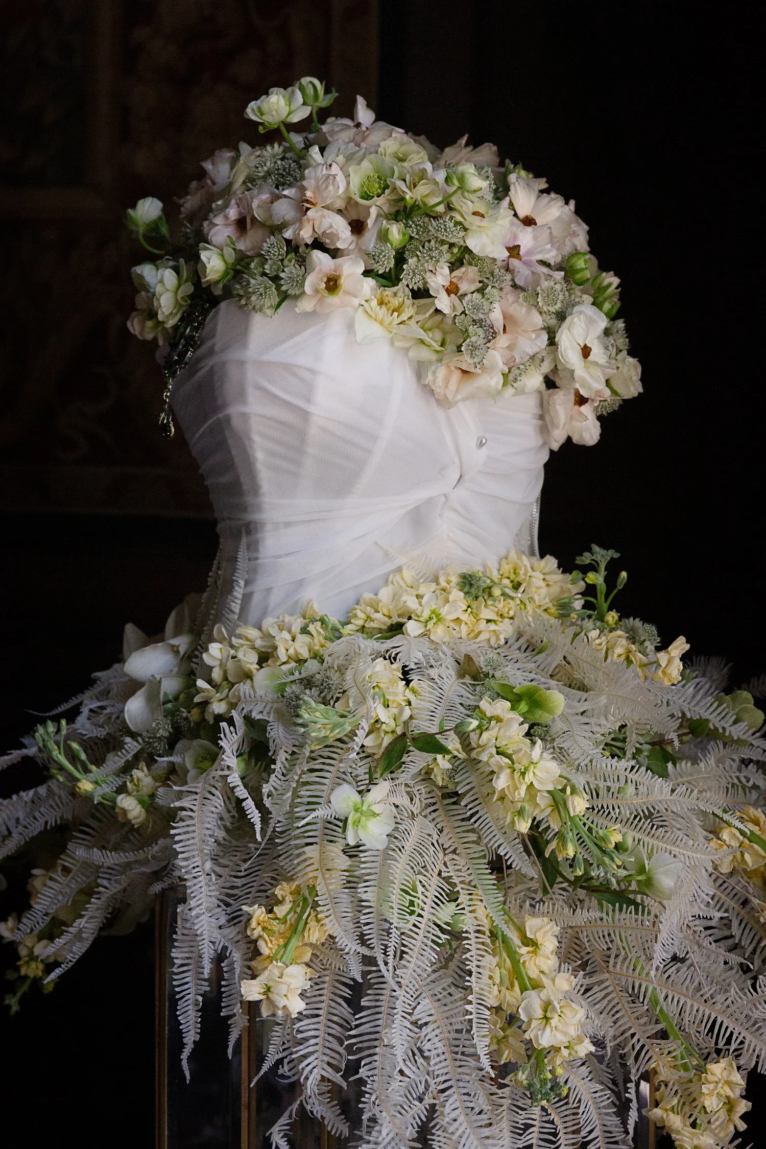 Florist’s inspiration: I found this particular portrait of interest to tackle as an interpretation in florals. Corsets and boning in dresses give such beautiful curves to a woman's body but there is still a physical aversion to staying constrained and desire to burst out of it and assume a natural and comfortable shape. The corset can be a restraint of a physical, thought process or emotional expression of a woman and I wanted to illustrate that through florals.