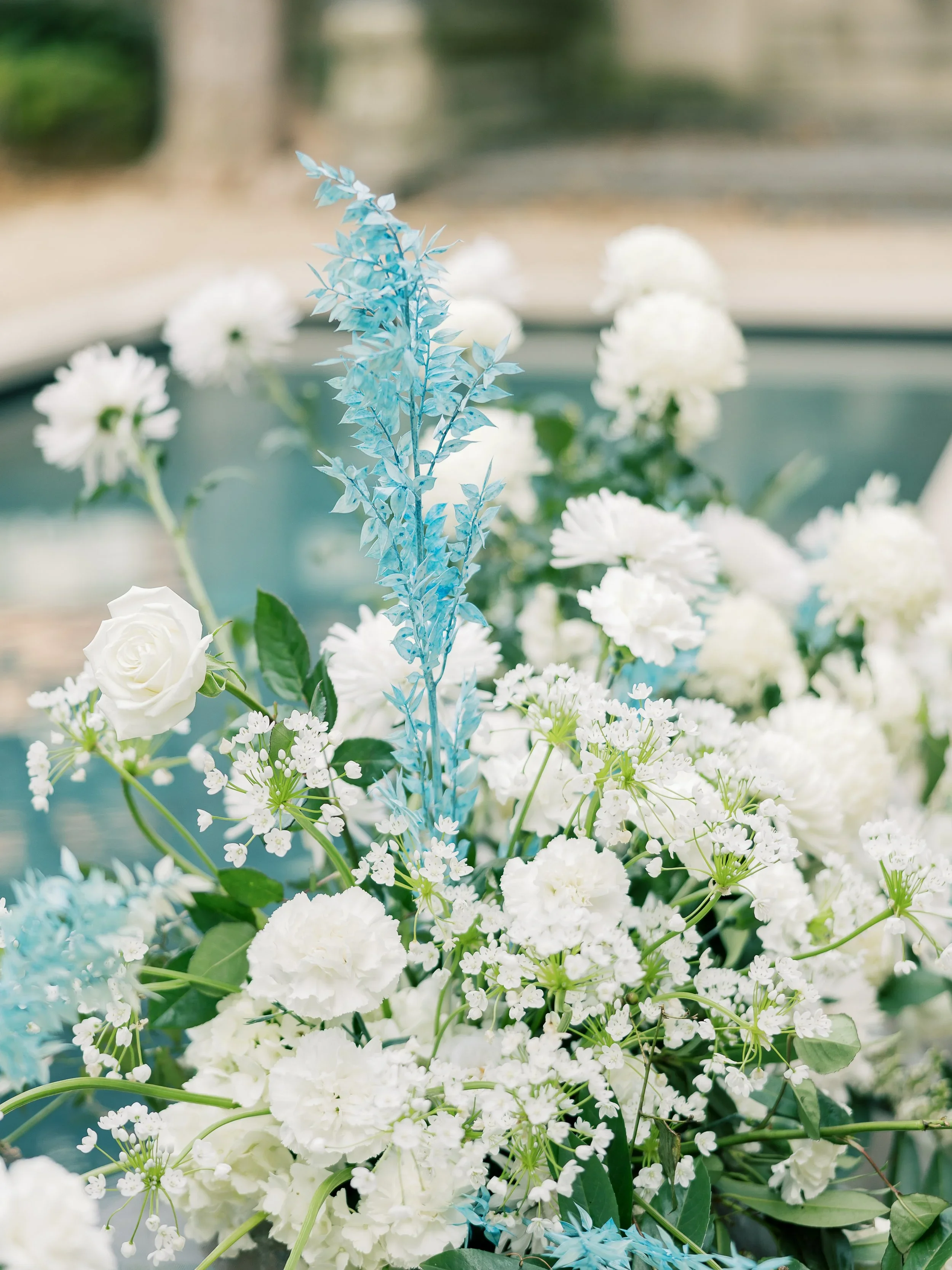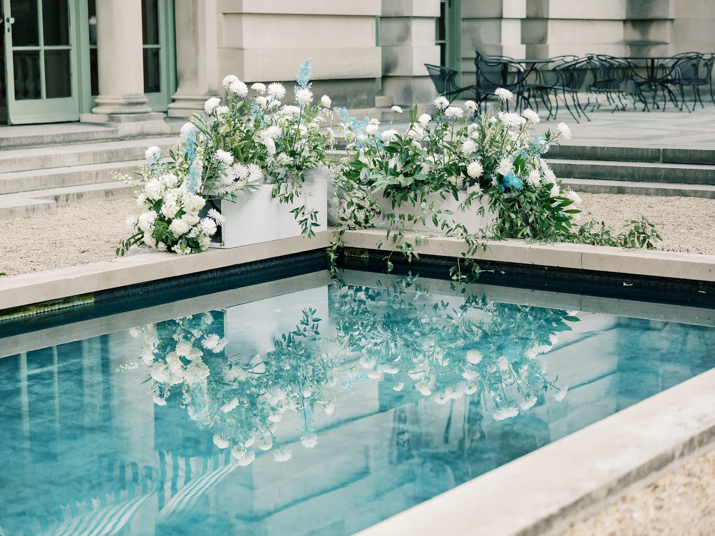 Florist’s inspiration: Channeling the tranquil, reflective quality of the pool. Our installation will be interactive; Created for guests to walk through, and around, engage with, and enjoy from all angles.