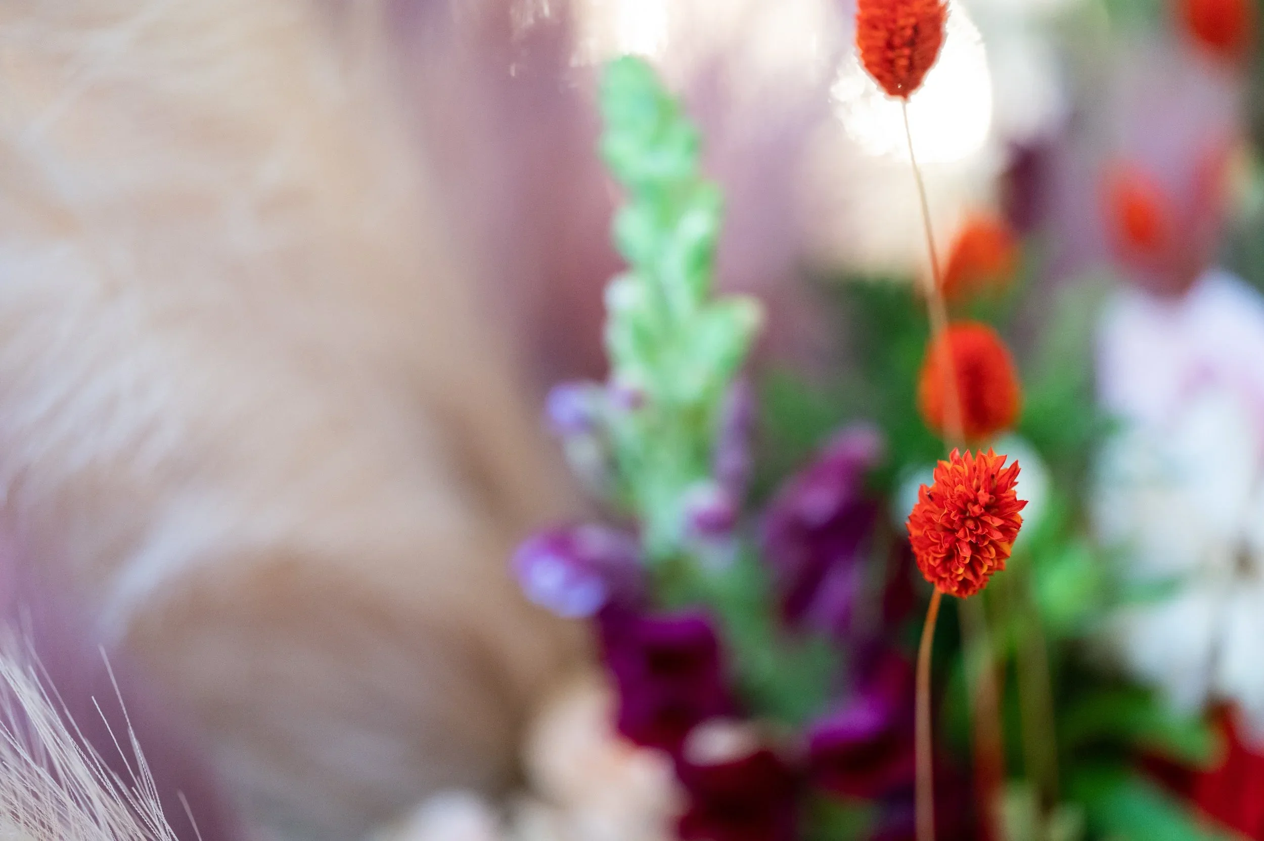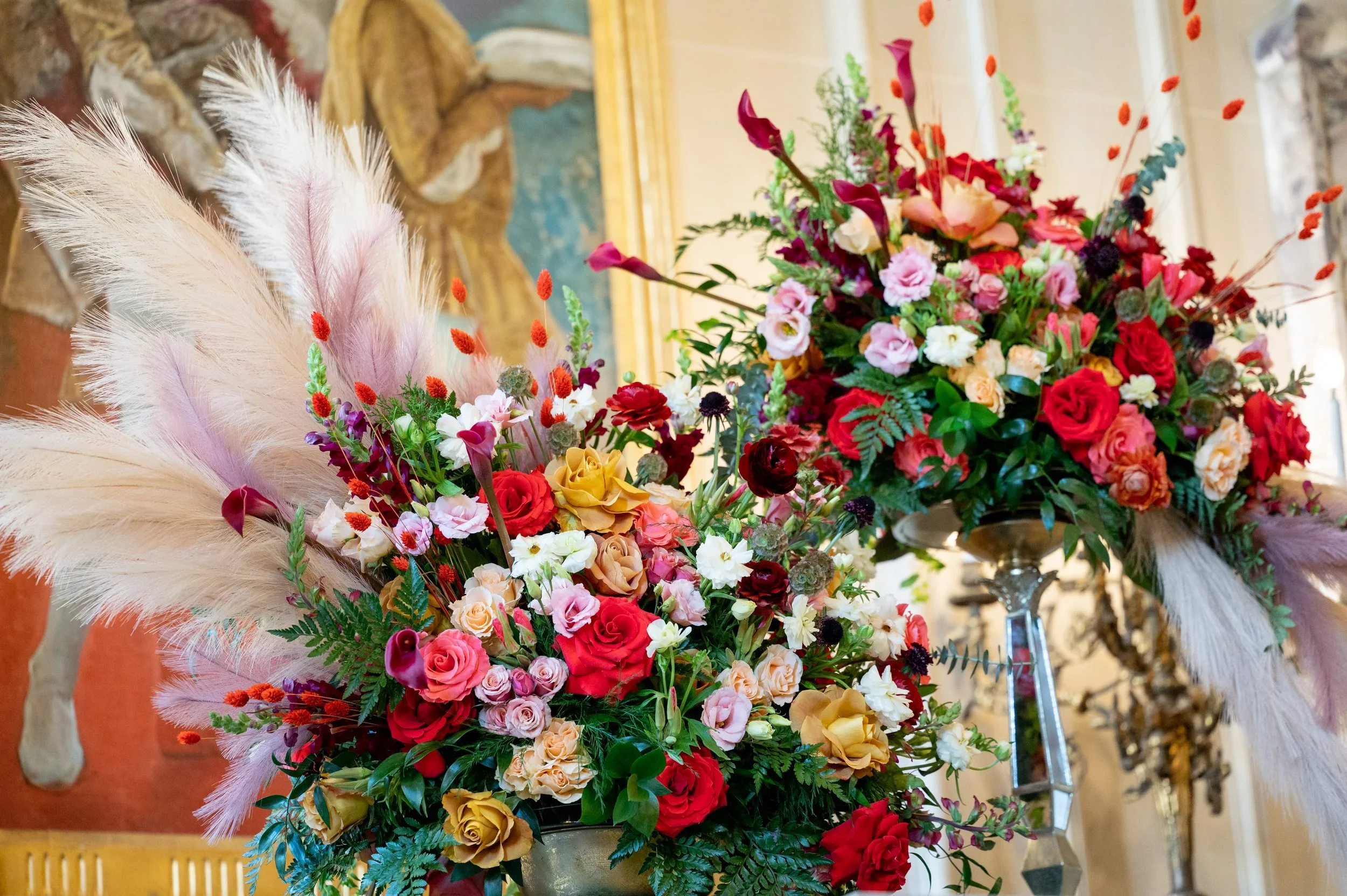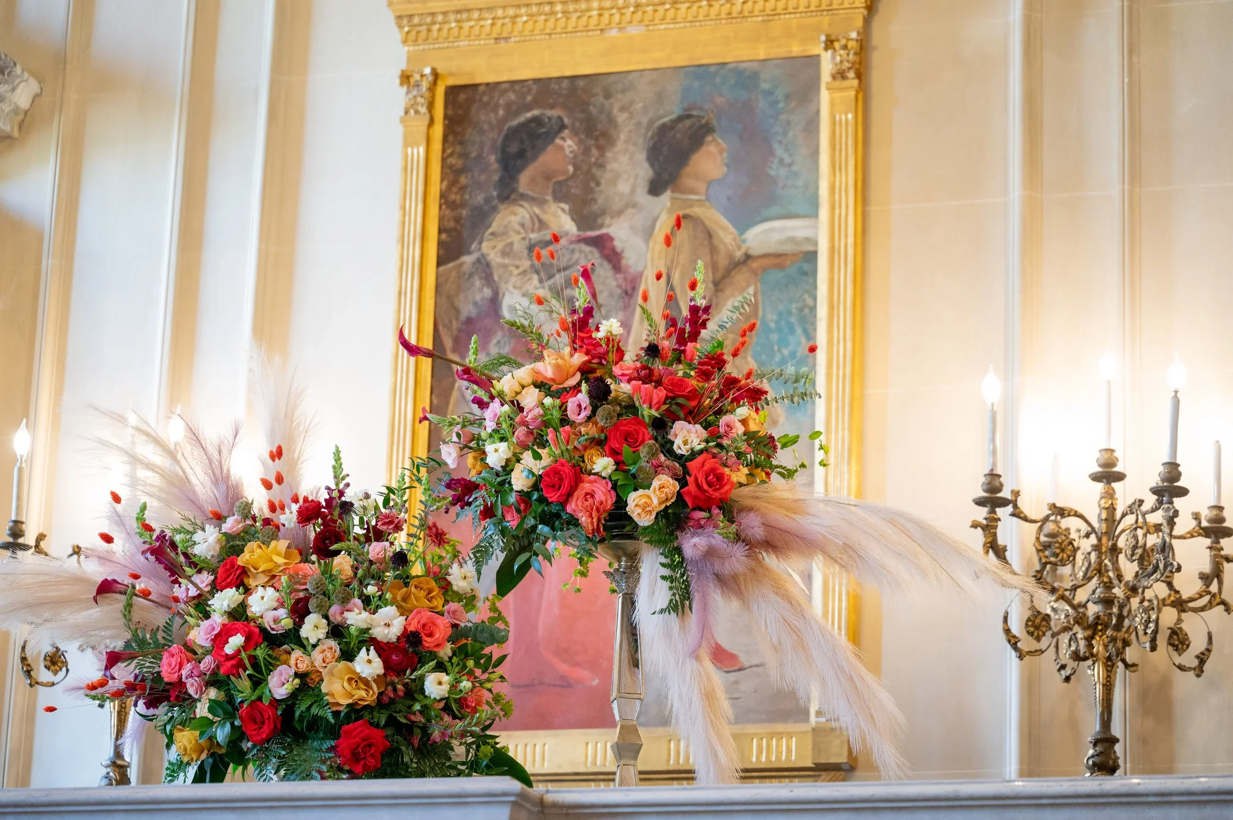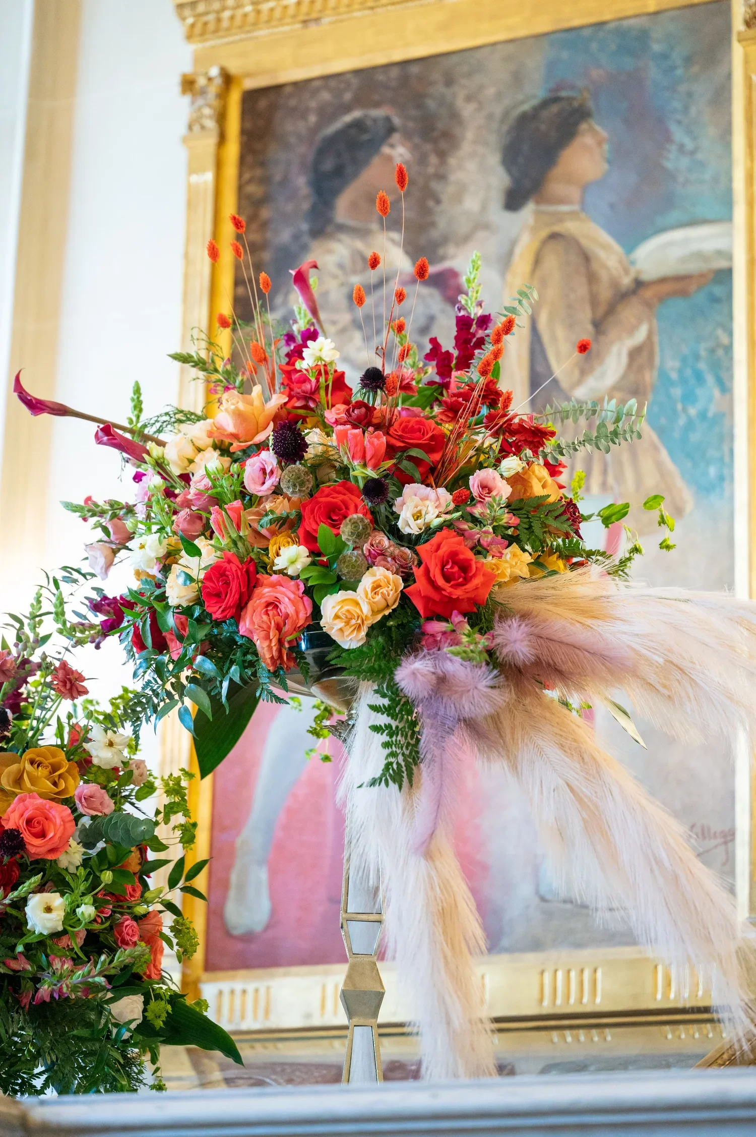 Florist’s inspiration: The art piece that we selected is one of three studies made in preparation of the great painting depicting the coronation of the Dogaressa of Venice, Maria Foscari, in 1423. The two pages are standing with great poise and gracefulness as they await the beginning of the coronation. An amazing art piece creates feeling and emotion. Drawing inspiration from the two pages, our floral art piece displays grace and poise similar to that of the pages. We selected the rich colors of coral with touches of burgundy and gold to accent the painting. The rose was added as an ever-present symbol of grace and strength as the butterfly ranunculus adds the soft delicate touch. The goal is to look upon the floral piece with admiration and awe much like the pages did on that day of crowning centuries ago.