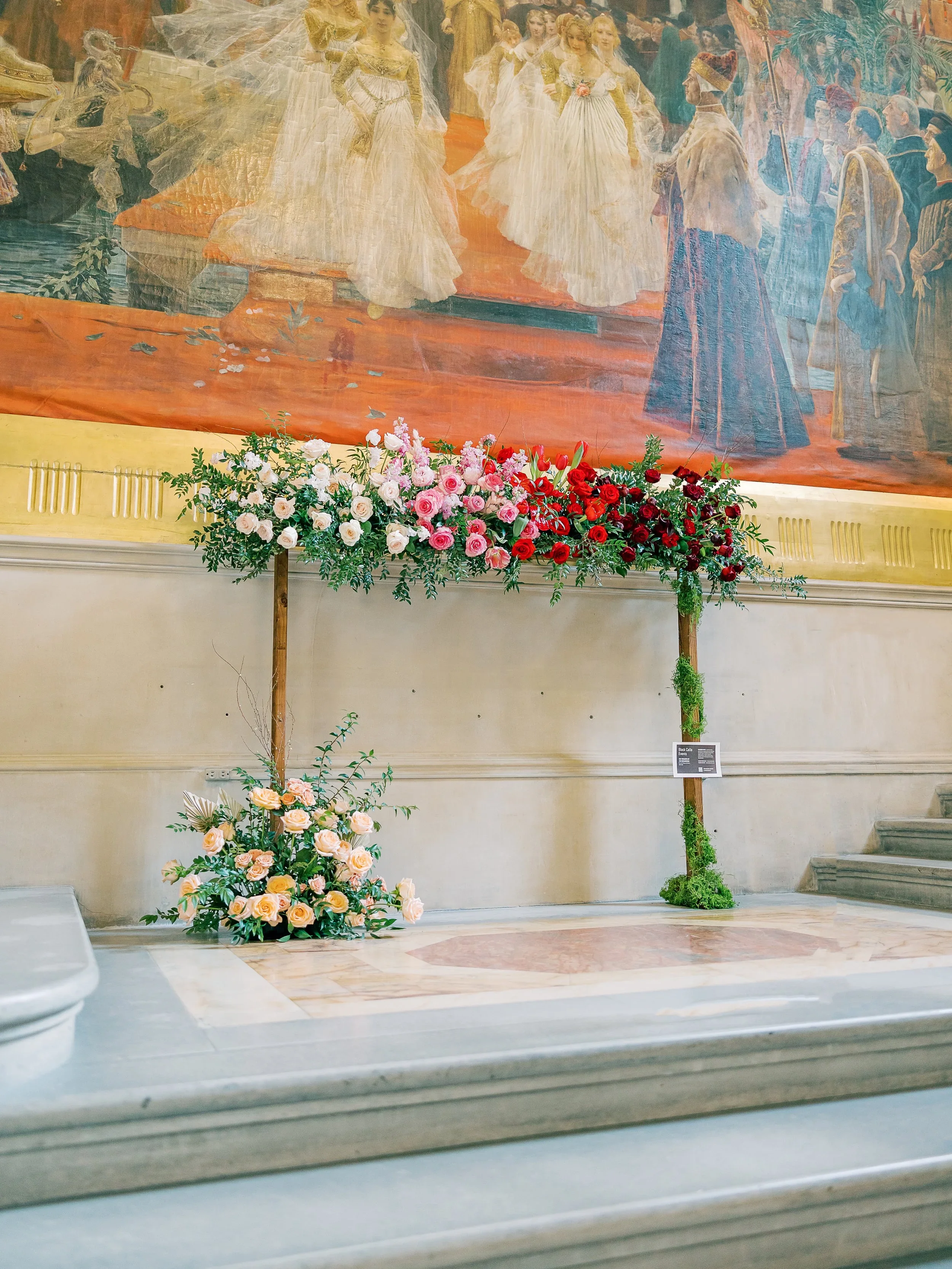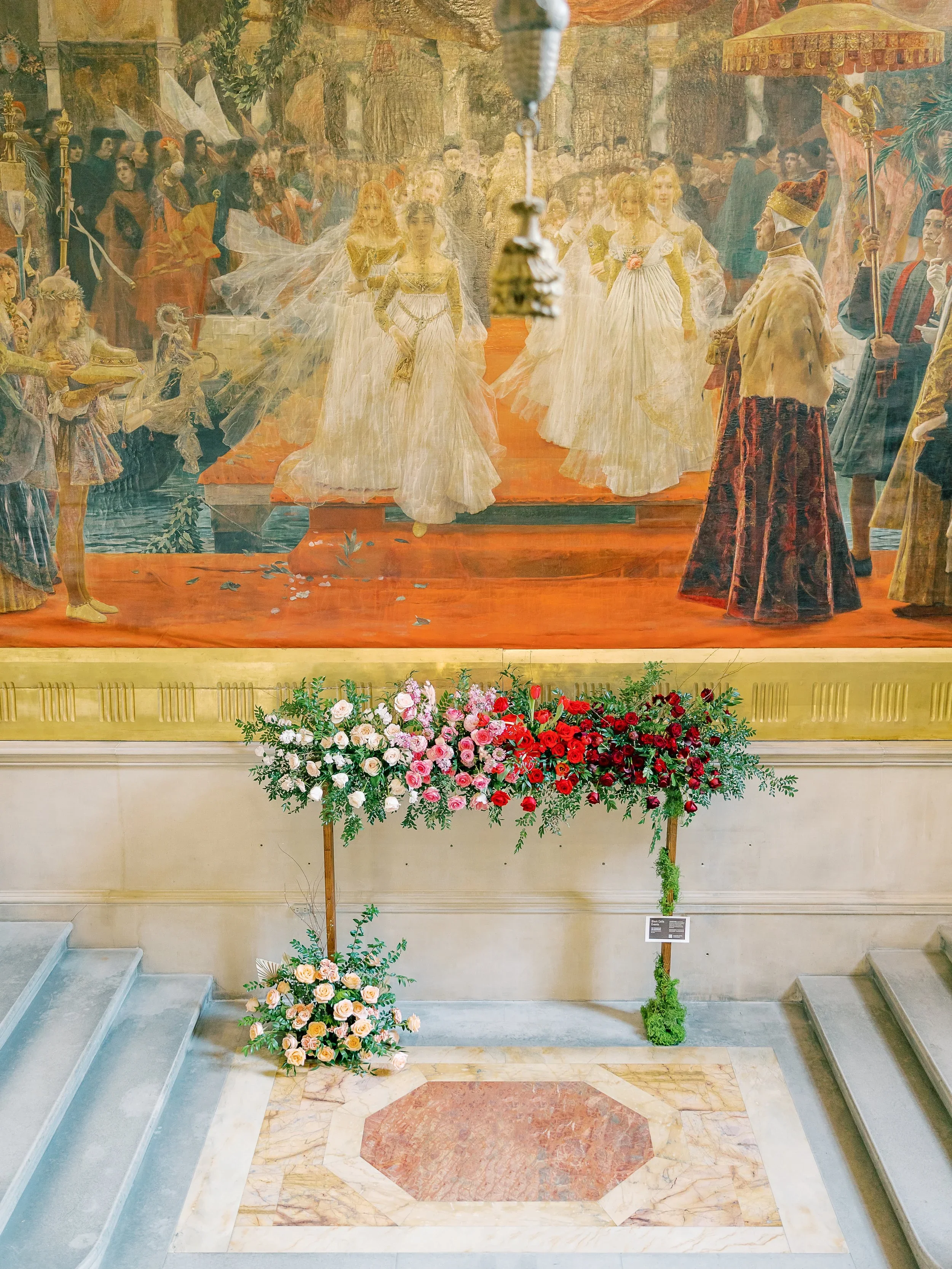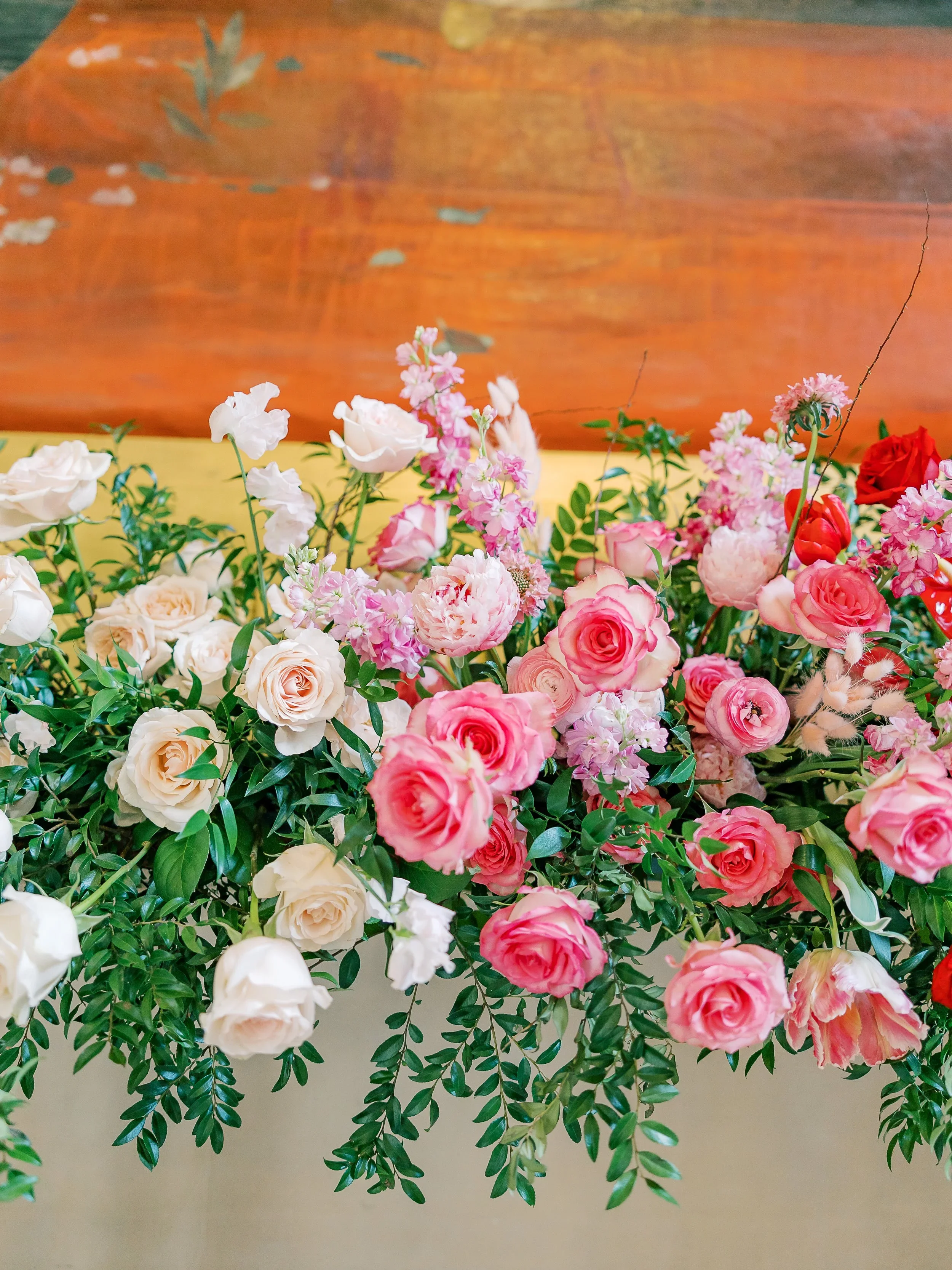 This floral arrangement is my own take of a modern twist on the traditional art piece. The grouping of colors transitioning from a bolder to a softer tone complements the colors being used in the painting with some added lush floral backdrop made from a variation of creeping greenery.