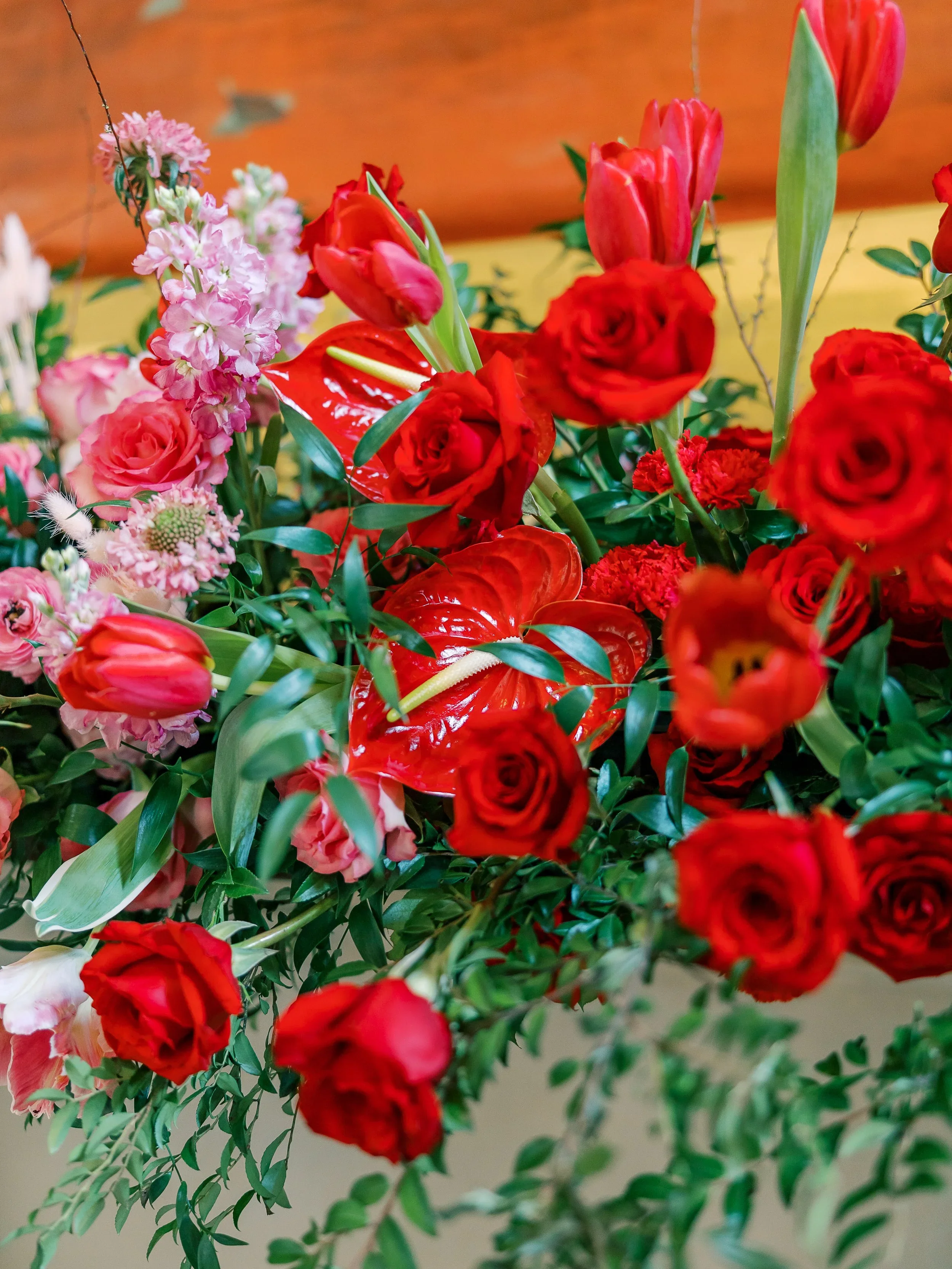 Recipe: This installation will be created by a self-standing wood frame with fresh cut seasonal floral blooms designed in a floral foam, together with a variety of greens that will add fullness to this floral piece. Some of the floral blooms include tulips, garden roses, peonies, stock, together with flowing greenery and some dry elements.